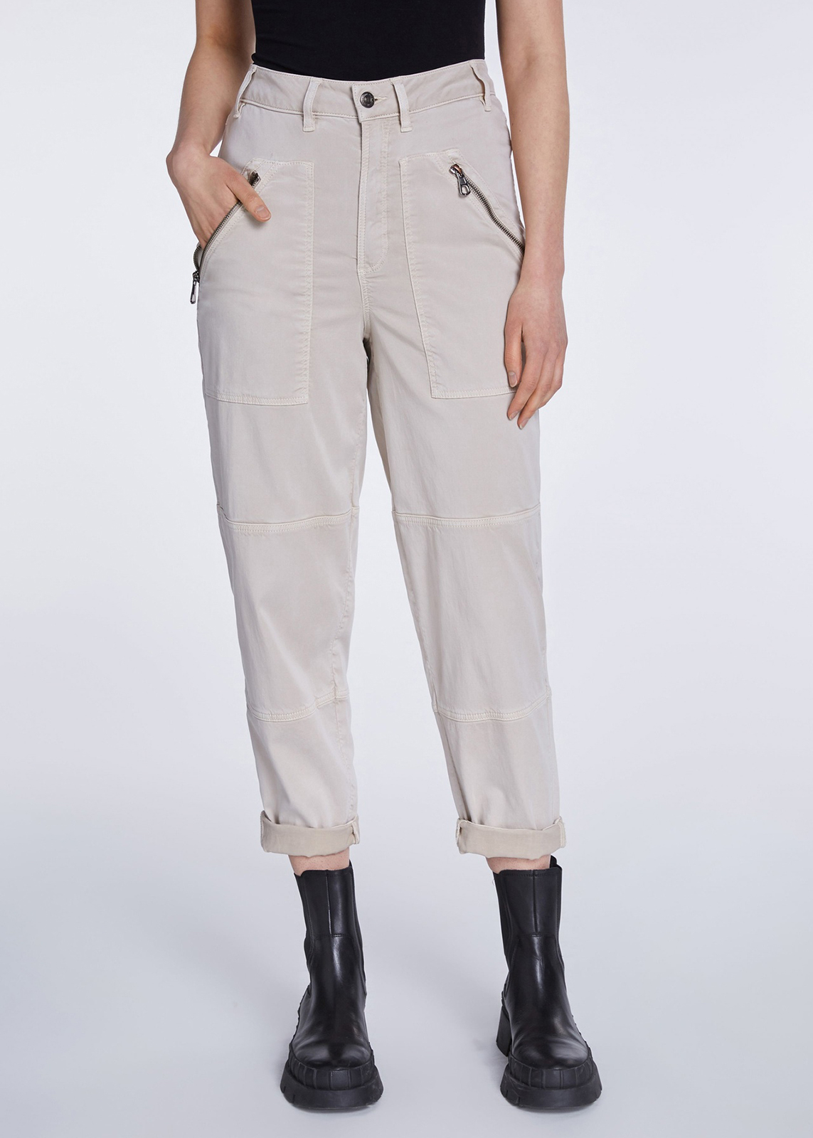 Однотонные брюки прямого кроя с рельефами. Комфортная высокая посадка, пояс со шлевками, застежка на скрытую молнию и пуговицу. Накладные передние карманы на молнии.