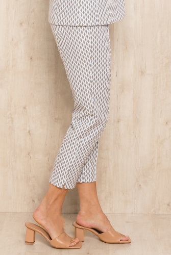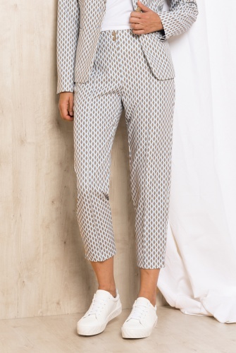 Укороченные брюки в геометрическом узоре – идеально сочетаются с жакетом из того же материала или могут быть самостоятельной деталью образа. Комфортная средняя посадка, пояс без шлевок. Швы спереди на штанинах. Застежка на две пуговицы и скрытую молнию.