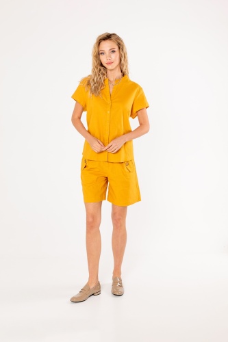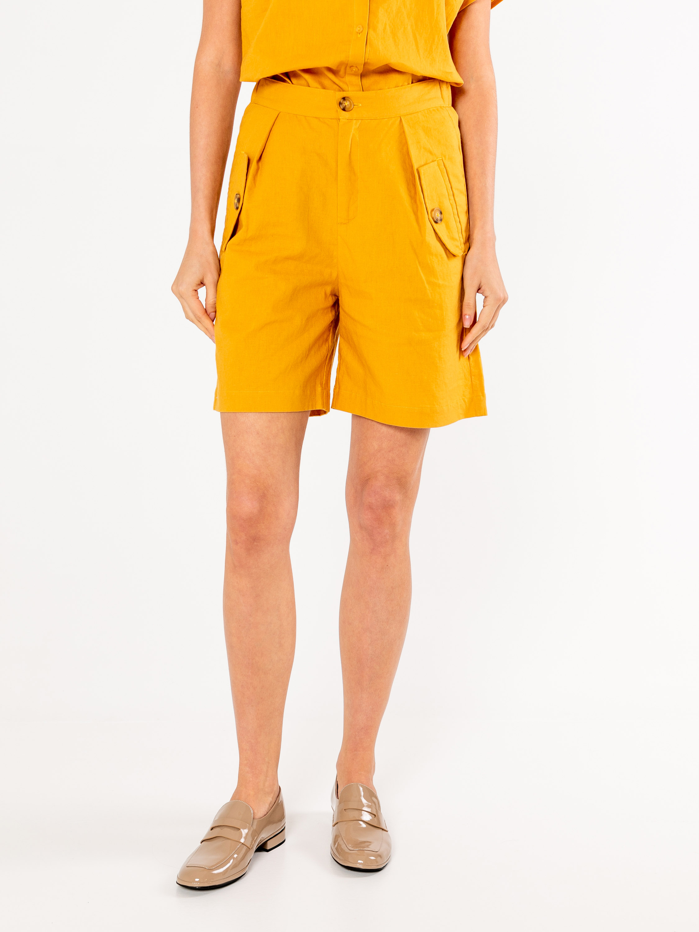 На сайте указаны российские размеры. Ткань: шорты выполнены из смеси льна и хлопка – натурального материала, который прекрасно пропускает воздух и не вызывает неприятных ощущений при носке. Крой: прямой силуэт со стандартной высотой пояса. Изысканные защипы моделируют фигуру, подчеркивают талию и гармонизируют область бедер. Функциональные карманы добавляют спортивного шика, делая образ современным и актуальным. Внизу расположены манжеты, которые при желании можно подвернуть, сделав шорты короче. Отделка: контрастные пуговицы на застежке и удобных карманах добавляют оригинальности модели. Застегиваются на молнию. В разделе блузок можно подобрать к шортам идеальную пару из идентичного материала, тем самым создав идеальный летний костюм.