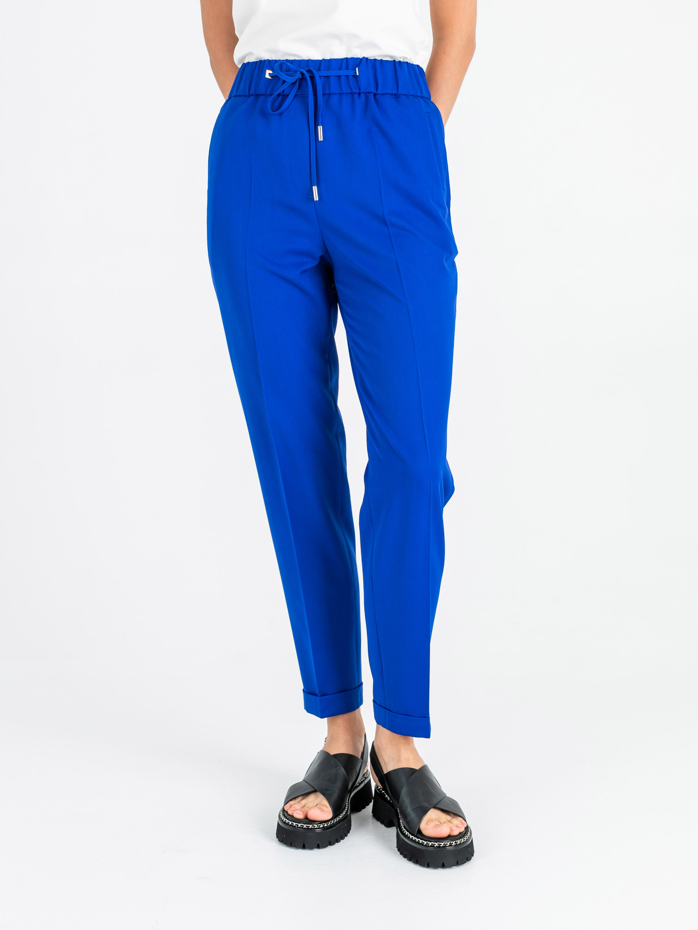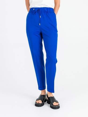 На сайте указаны российские размеры. Ткань: смесовая ткань средней плотности (72% полиэстер, 22% вискоза, 6% эластан). Идеальны для лета и весны. Крой: повседневные брюки в стиле спорт-шик – выбор активных женщин, для которых важен не только комфорт, но и внешний вид одежды. Имеют слегка прилегающий силуэт, подчеркивающий красоту фигуры. Модель с завышенной талией, прикрывает зону живота. Удобный пояс-резинка обеспечивает максимальный комфорт и надевание брюк в течение нескольких секунд. Отделка: модель с двумя функциональными прорезными карманами спереди и двумя карманами сзади. Стрелка на брюках «снижает» градус спорта и добавляет женственной повседневности. Манжеты подчеркивают красоту щиколоток, а тонкий шнурок с серебряными концами позволяет регулировать ширину пояса. Параметры модели: 86-61-91 см Рост 177 см