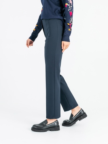 Классические брюки со стрелками и завышенной талией на скрытой пуговице. По 2 имитированных кармана спереди и сзади. Ткань: однотонная костюмная ткань средней плотности (78% полиэстер, 16% вискоза, 6% эластан). Не мнется в процессе носки. Крой: неоклассическая модель прямых брюк со средней посадкой. За классику отвечают строгие стрелки, прекрасно вытягивающие силуэт, за новаторство – красивые неконтрастные строчки в области пояса. Сзади расположены два прорезных кармана. Отделка: в передней части брюк выделяется оригинальный декоративный карман, который по геометрии хорошо сочетается с вертикальными строчками, идущими от пояса. Параметры модели: 86-61-91 см Рост 177 см