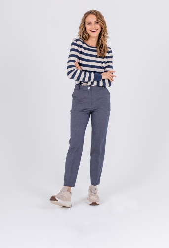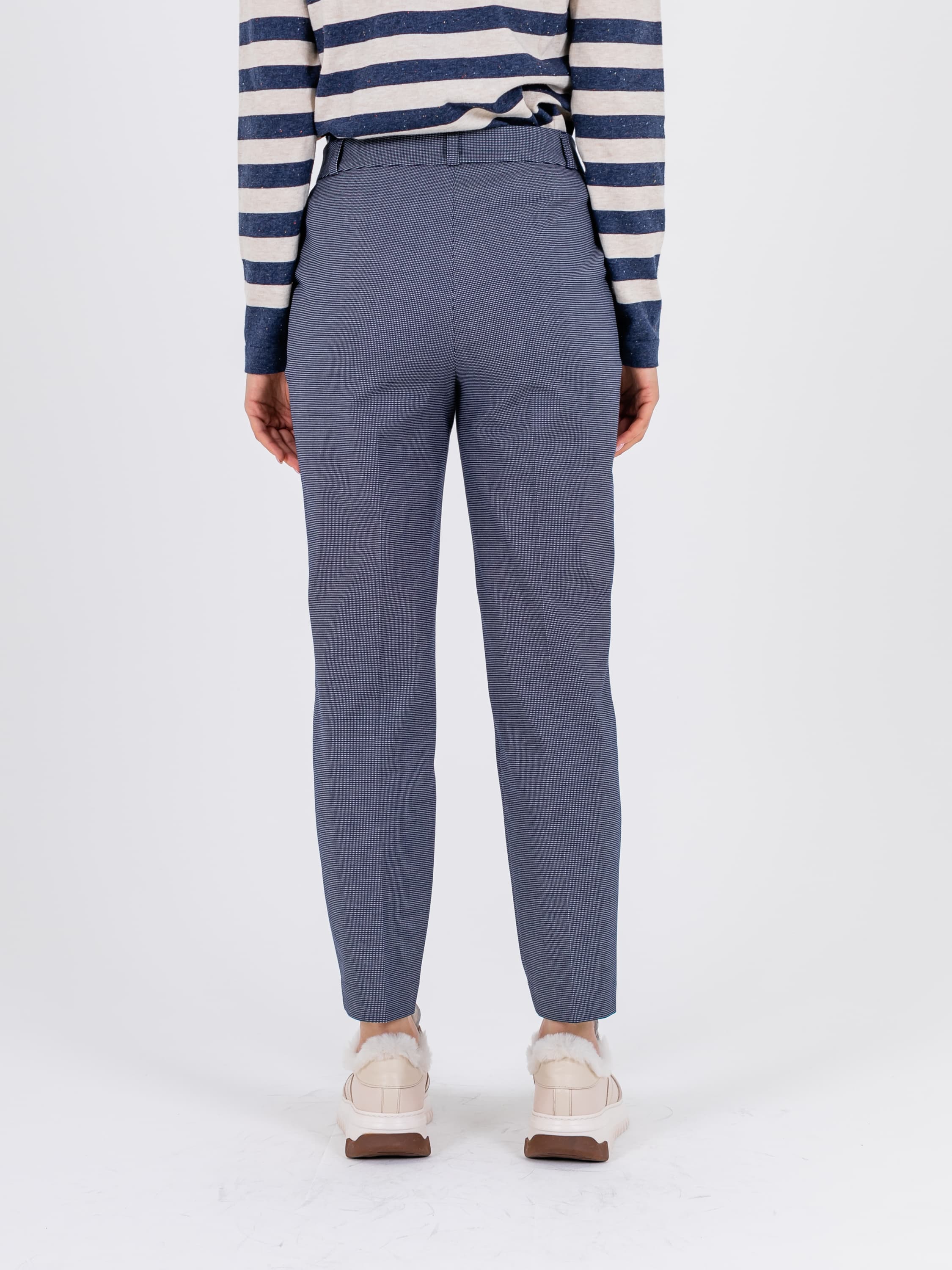 На сайте указаны российские размеры. Ткань: гладкая костюмная ткань в клетку (32% вискоза, 62% полиэстер, 6% эластан) Крой: брюки прямого силуэта с высокой линией талии, которая подчеркивает достоинства фигуры. Имеют стрелку, создающую дополнительную вертикаль и делающую образ законченным. Два функциональных кармана можно использовать для хранения важных вещей, которые не хочется держать в руках. Застегиваются на молнию и пуговицу. Отделка: в модели предусмотрены шлевки, в которые можно вдеть тонкий пояс или платок. Рост модели: 175 см.