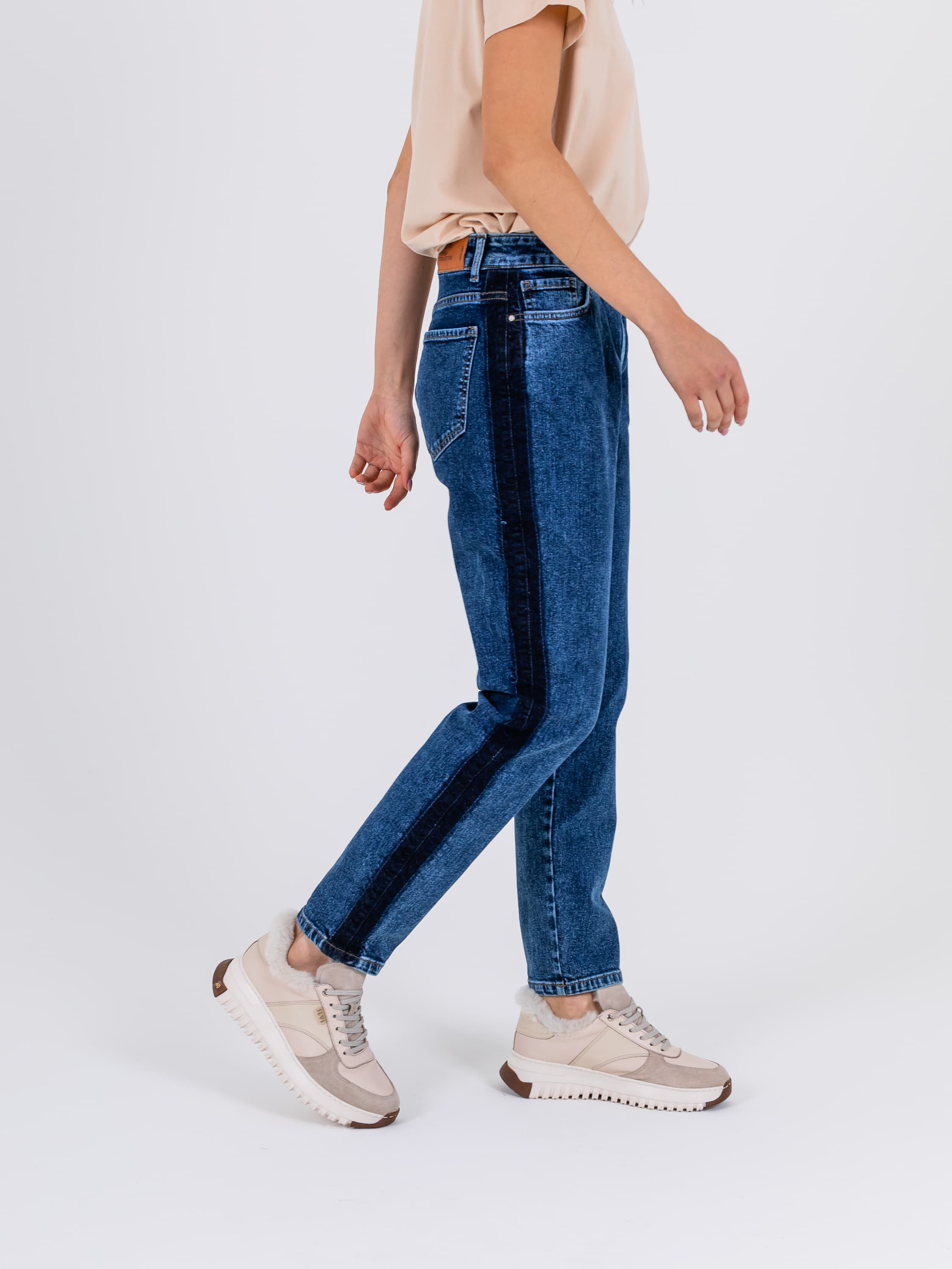 На сайте указаны российские размеры. Классические джинсы MOM c интересной затемненной полоской по внешнему бокововому шву модели. Рост модели 175 см.