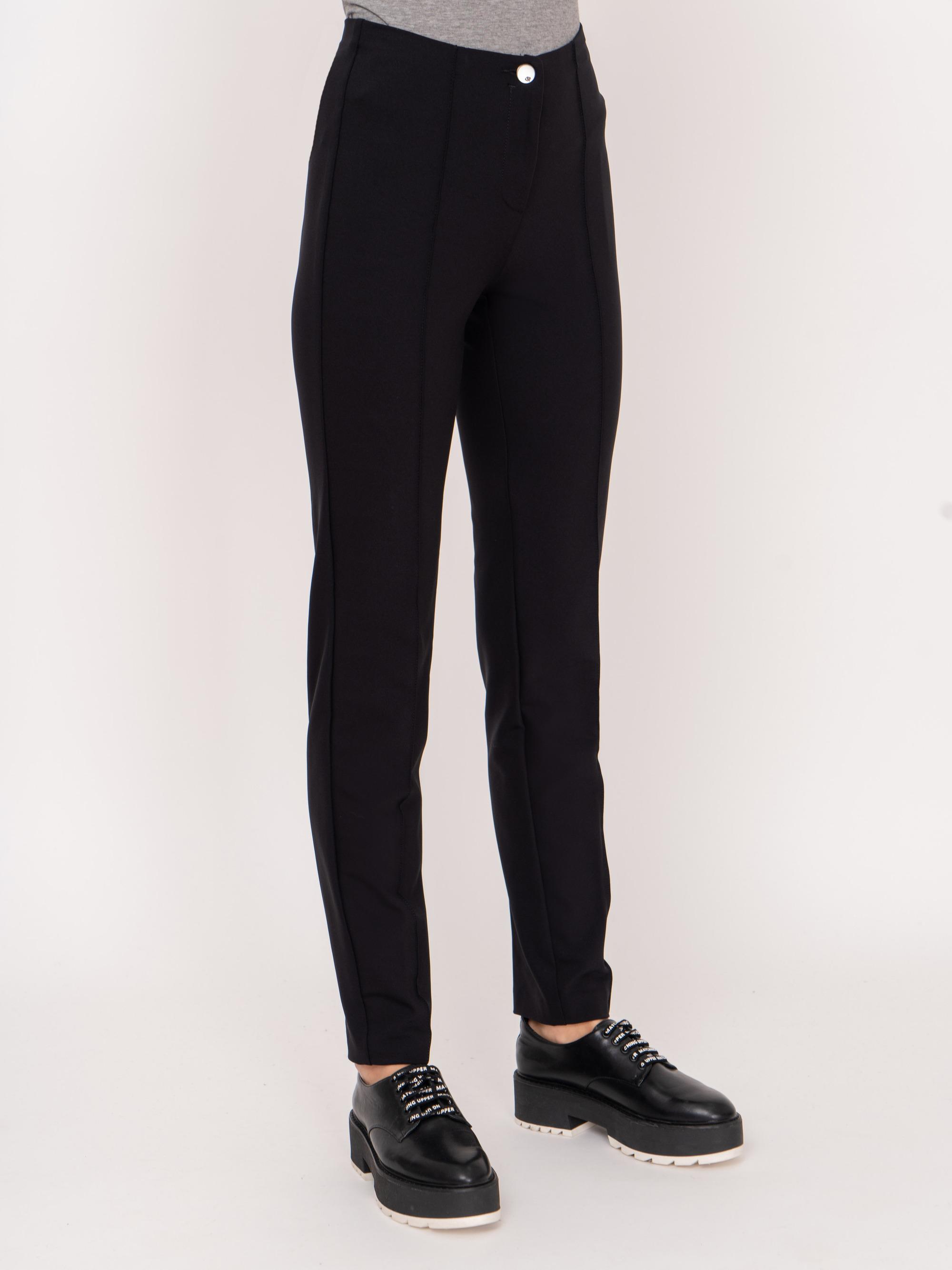 На сайте указаны российские размеры. Зауженные текстильные черные брюки на молнии без карманов, с акцентными швами спереди. Рост модели: 175 см. Длина брюк: 81 см.