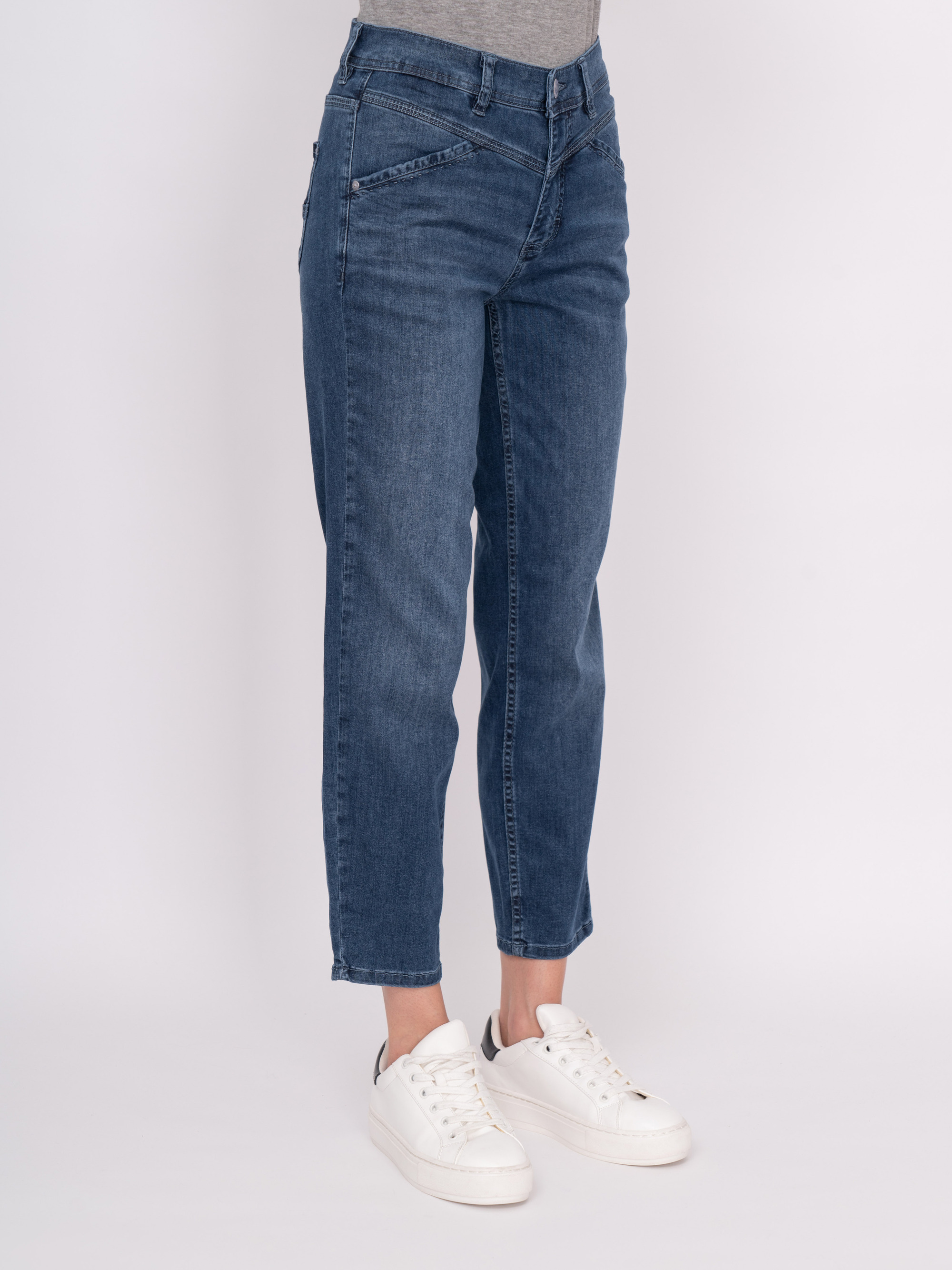 На сайте указаны российские размеры. Зауженные укороченные синие джинсы на молнии с косыми карманами, с накладными карманами. Рост модели 175 см. Длина брюк: 67 см.