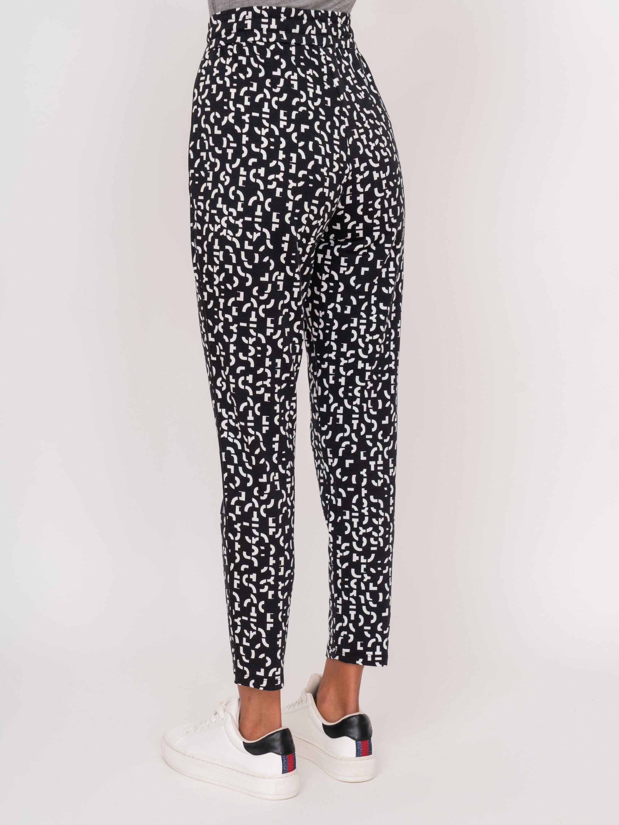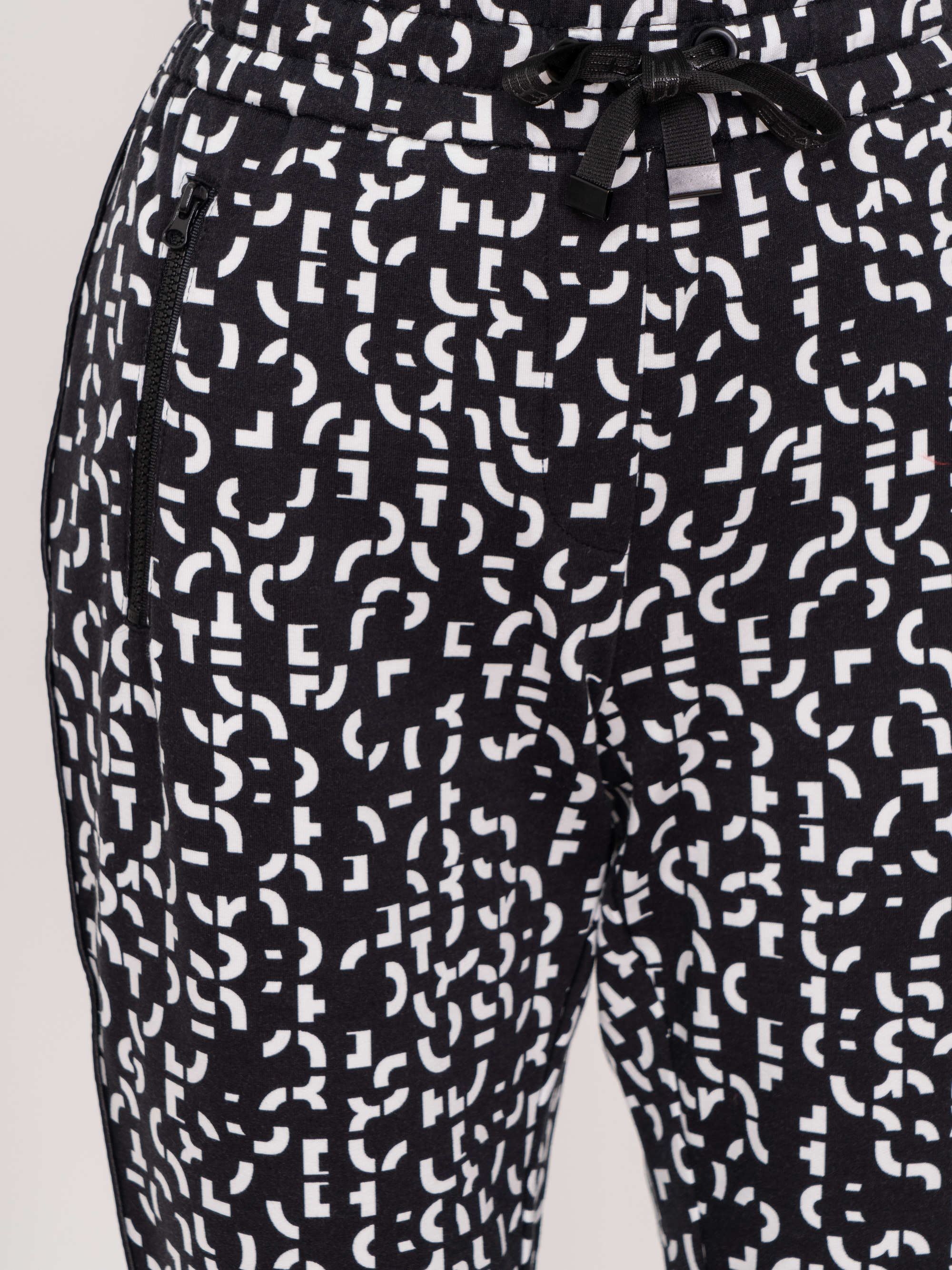 На сайте указаны российские размеры. Трикотажные черные зауженные брюки на резинке с завязками, с прорезными карманами на молнии, с белым абстрактным рисунком. Рост модели: 175 см. Длина брюк: 70 см.