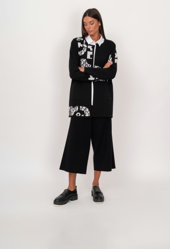 На сайте указаны российские размеры. Трикотажные черные укороченные широкие брюки на резинке, с накладными карманами. Рост модели: 175 см. Длина брюк: 60 см.