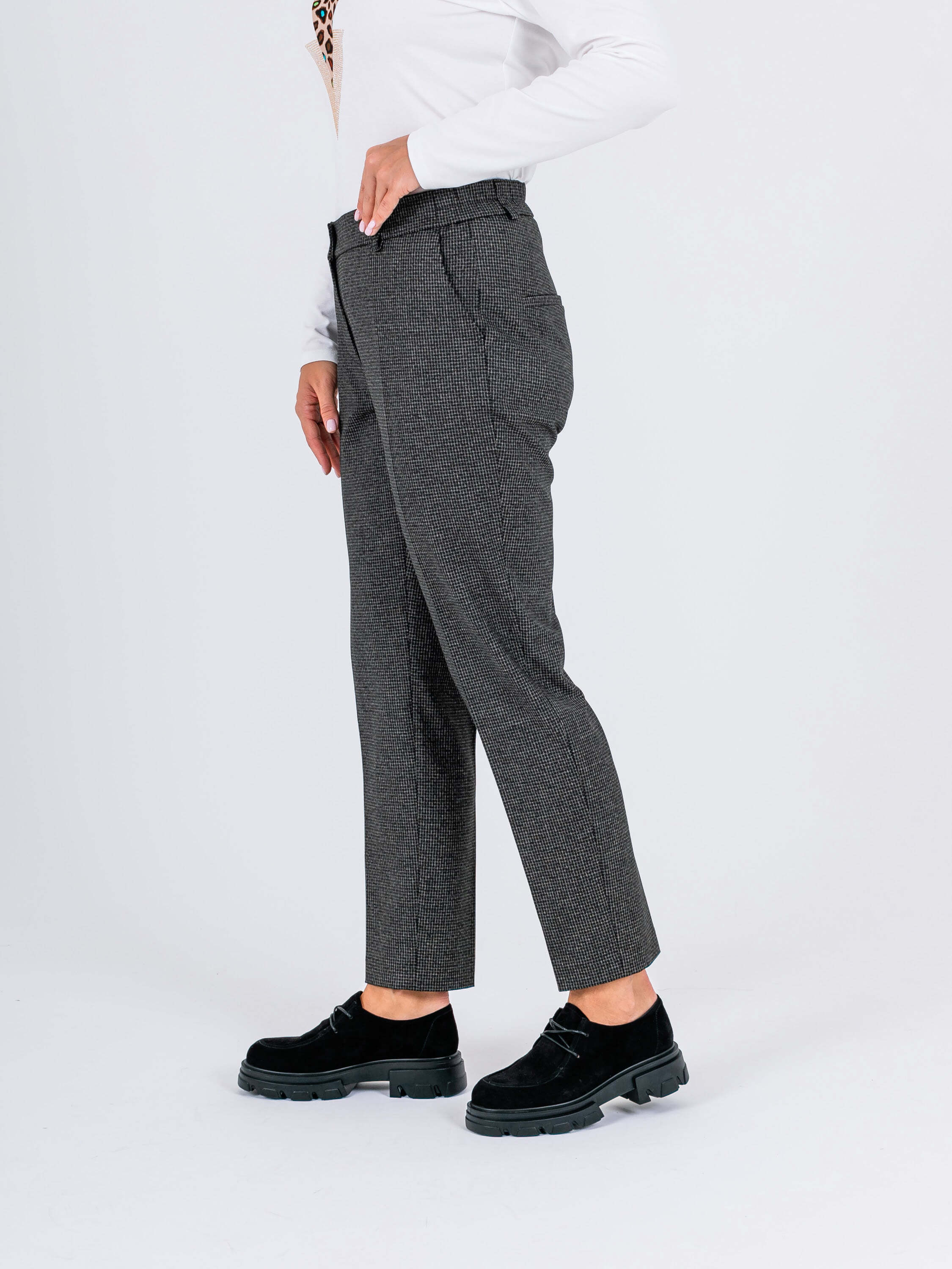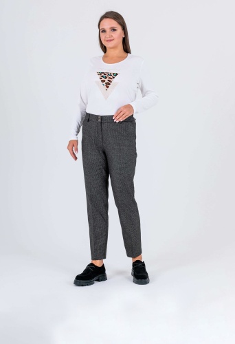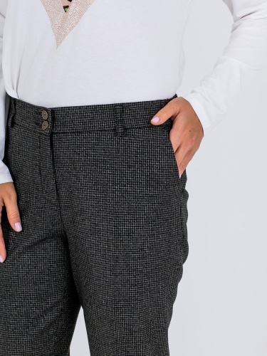 На сайте указаны российские размеры. Ткань: смесовая ткань в мелкую клетку средней плотности (63% полиэстер, 32% вискоза, 5% эластан) Крой: современная классика – брюки прямого кроя с высокой посадкой, идеально сидящие по фигуре. Имеют два удобных кармана спереди и два прорезных кармана сзади, а также строгие стрелки, которые добавляют образу законченности и стиля. Застегиваются на молнию и пуговицы. Отделка: задний карман украшен фирменным шильдиком Stern. В модели предусмотрены шлевки, в которые можно вдеть тонкий пояс или платок
