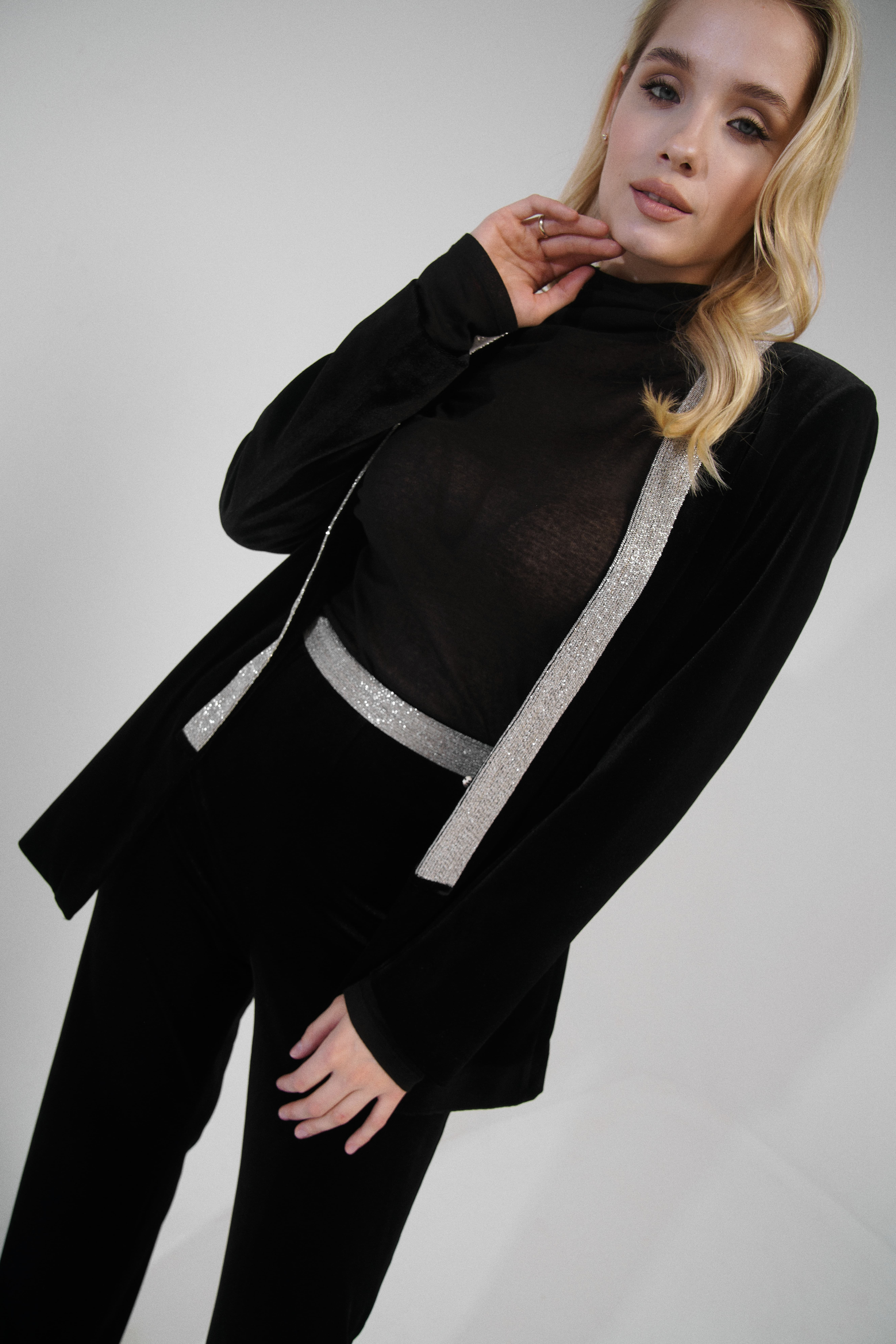 На сайте указаны российские размеры. Расклешенные бархатные брюки с высоким поясом. Украшена модель стразами и поясе. Застежка-молния. Идеально с бархатным жакетом от NISSA (арт. S11909)
