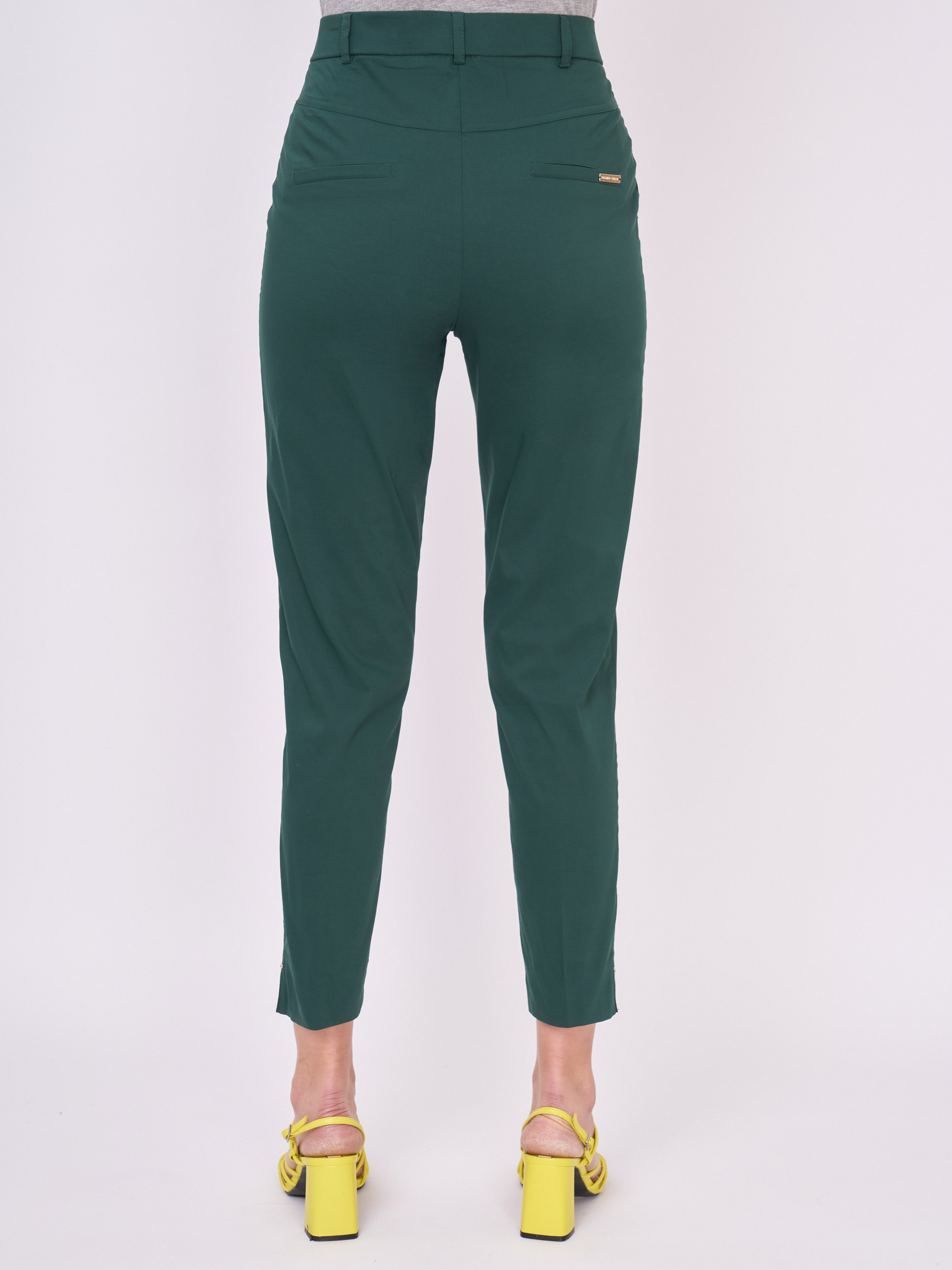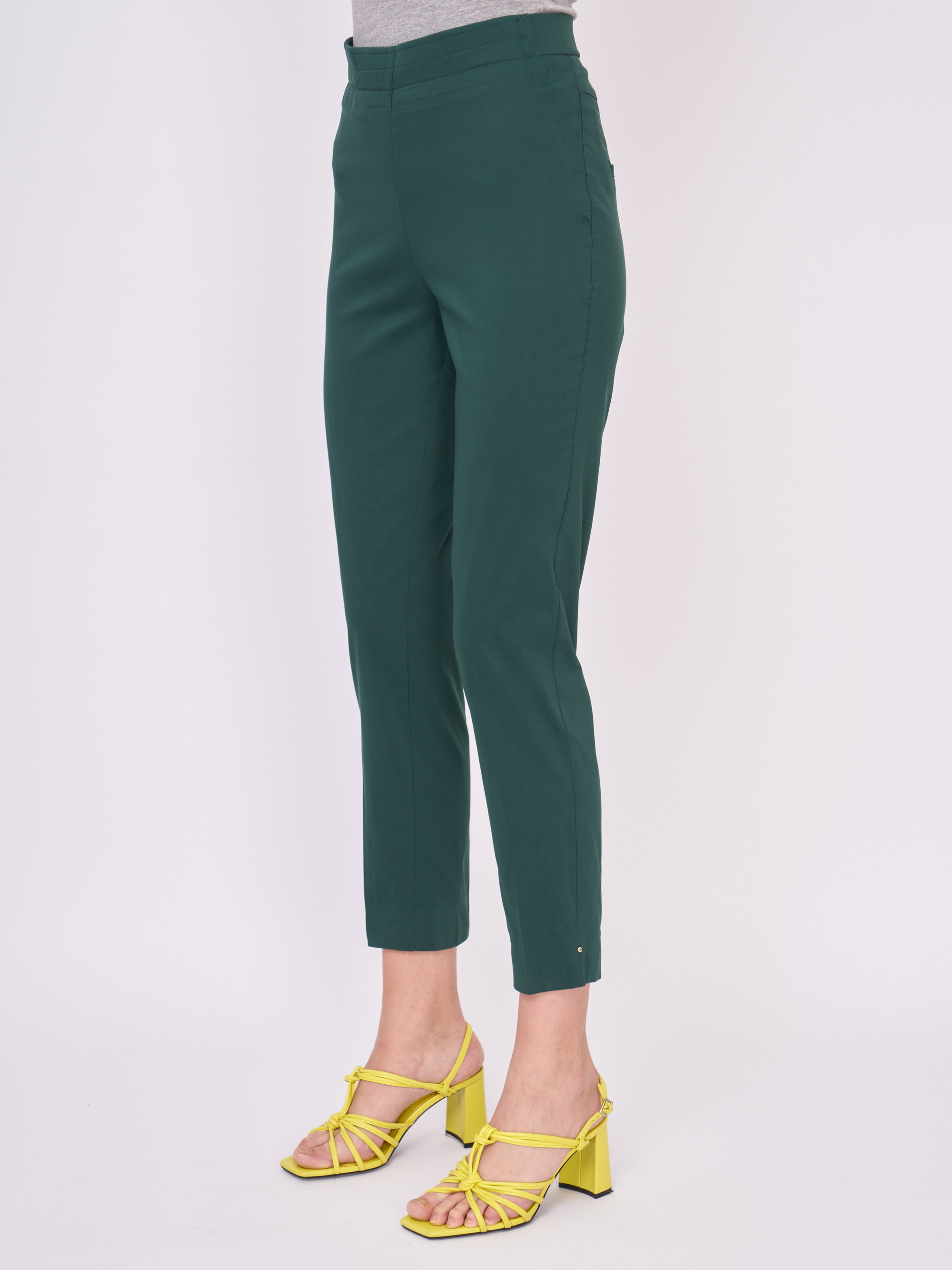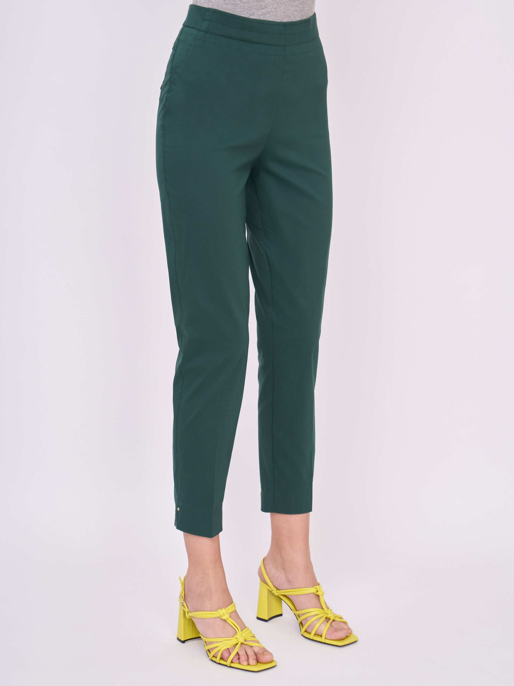 На сайте указаны российские размеры. Хлопковые зауженные темно-зеленые брюки на резинке, без карманов. Длина брюк: 71 см. Рост модели: 177 см.