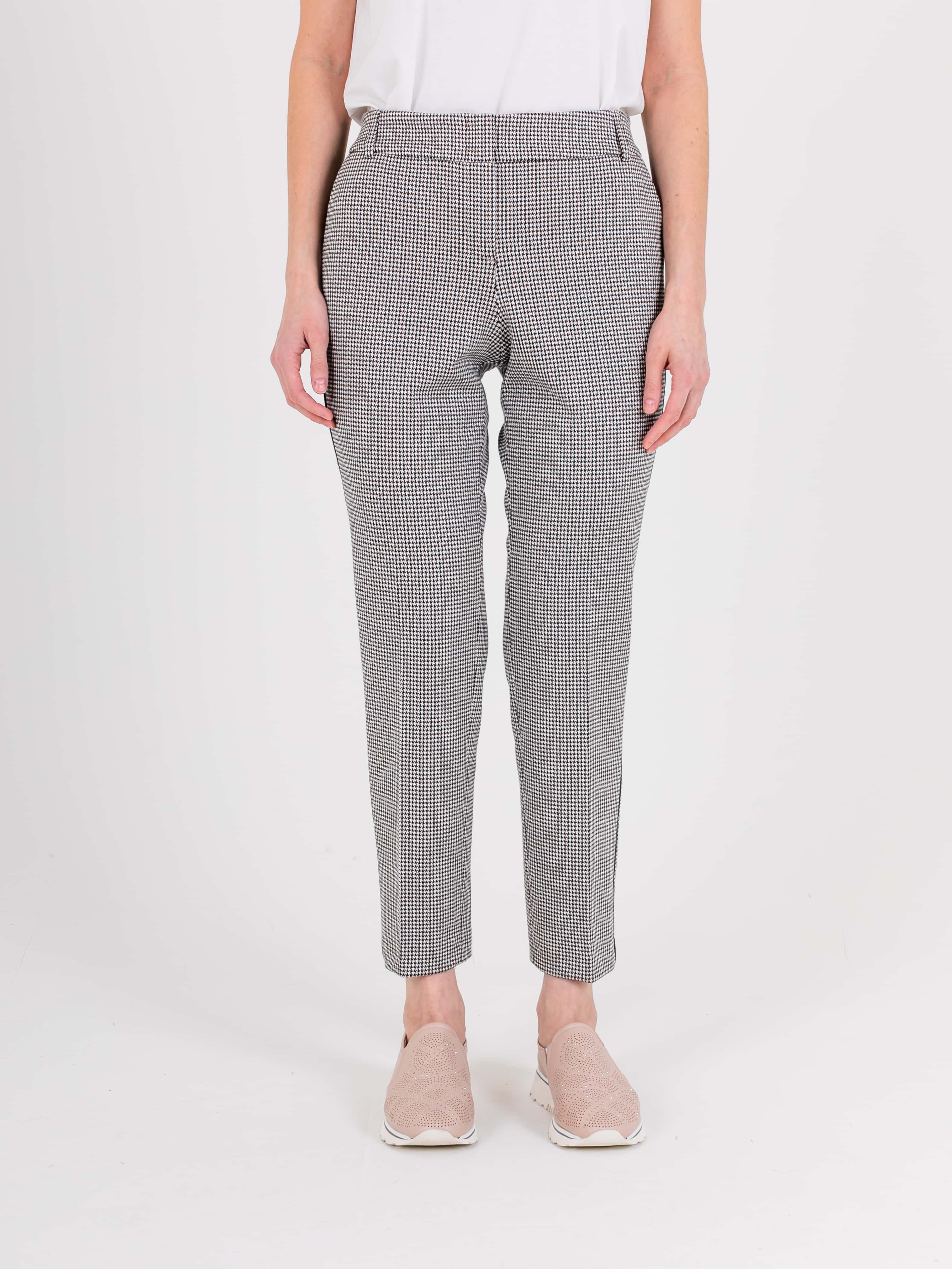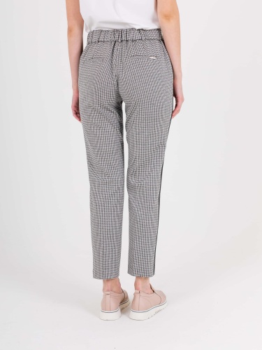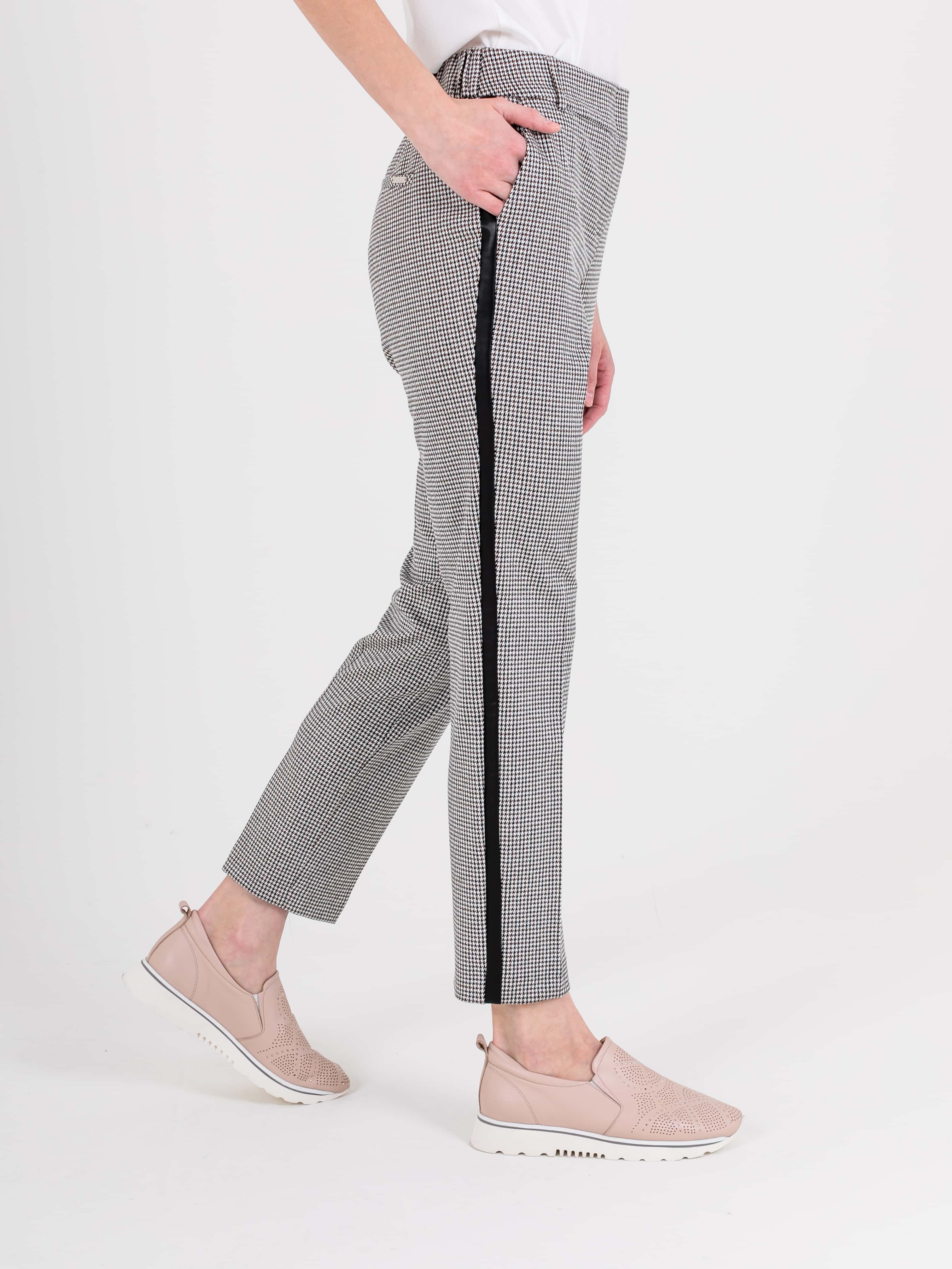 Прямые брюки с завышенной талией длиной до щиколотки с застежкой на молнию и 1 пуговицу, дизайнерская особенность модели – принт «клетка» и лампасы в боковых швах. Брюки слегка зауженные книзу. На передних половинках расположены два кармана с отрезным бочком. На задних половинках два прорезных кармана с листочками. Верх брюк обработан поясом на резинке со шлевками.