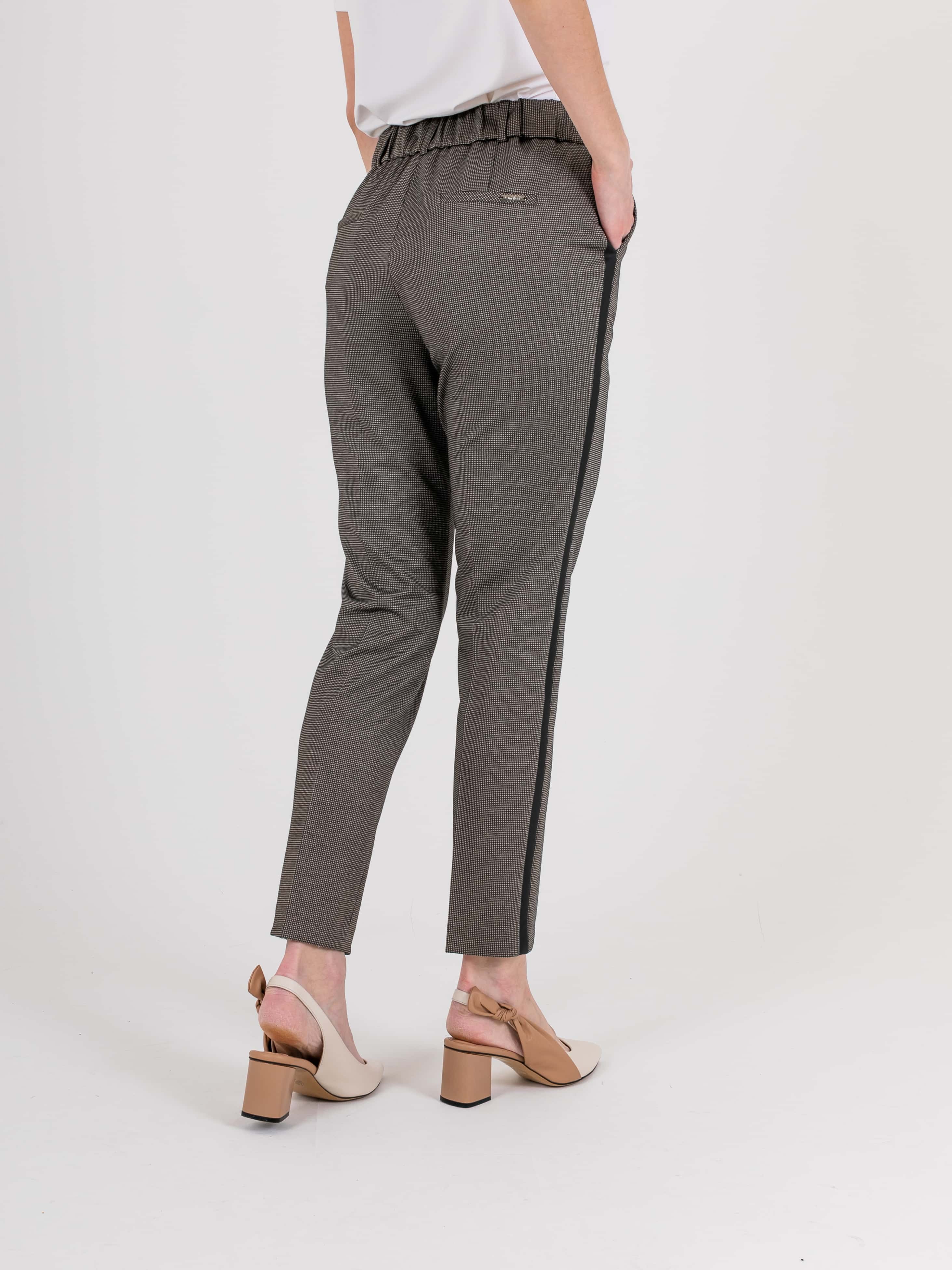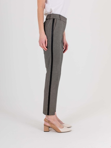Прямые брюки с завышенной талией длиной до щиколотки с застежкой на молнию и 1 пуговицу, дизайнерская особенность модели – принт «клетка» и лампасы в боковых швах. Брюки слегка зауженные книзу. На передних половинках расположены два кармана с отрезным бочком. На задних половинках два прорезных кармана с листочками. Верх брюк обработан поясом на резинке со шлевками.