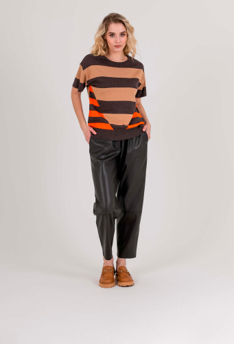 Брюки прямые со швами на коленях, с имитацией гульфика без застежки. На передних половинках расположены два кармана с отрезным бочком. Верх брюк обработан поясом на резинке со шнурами и металлическими наконечниками, для удобства регулировки.