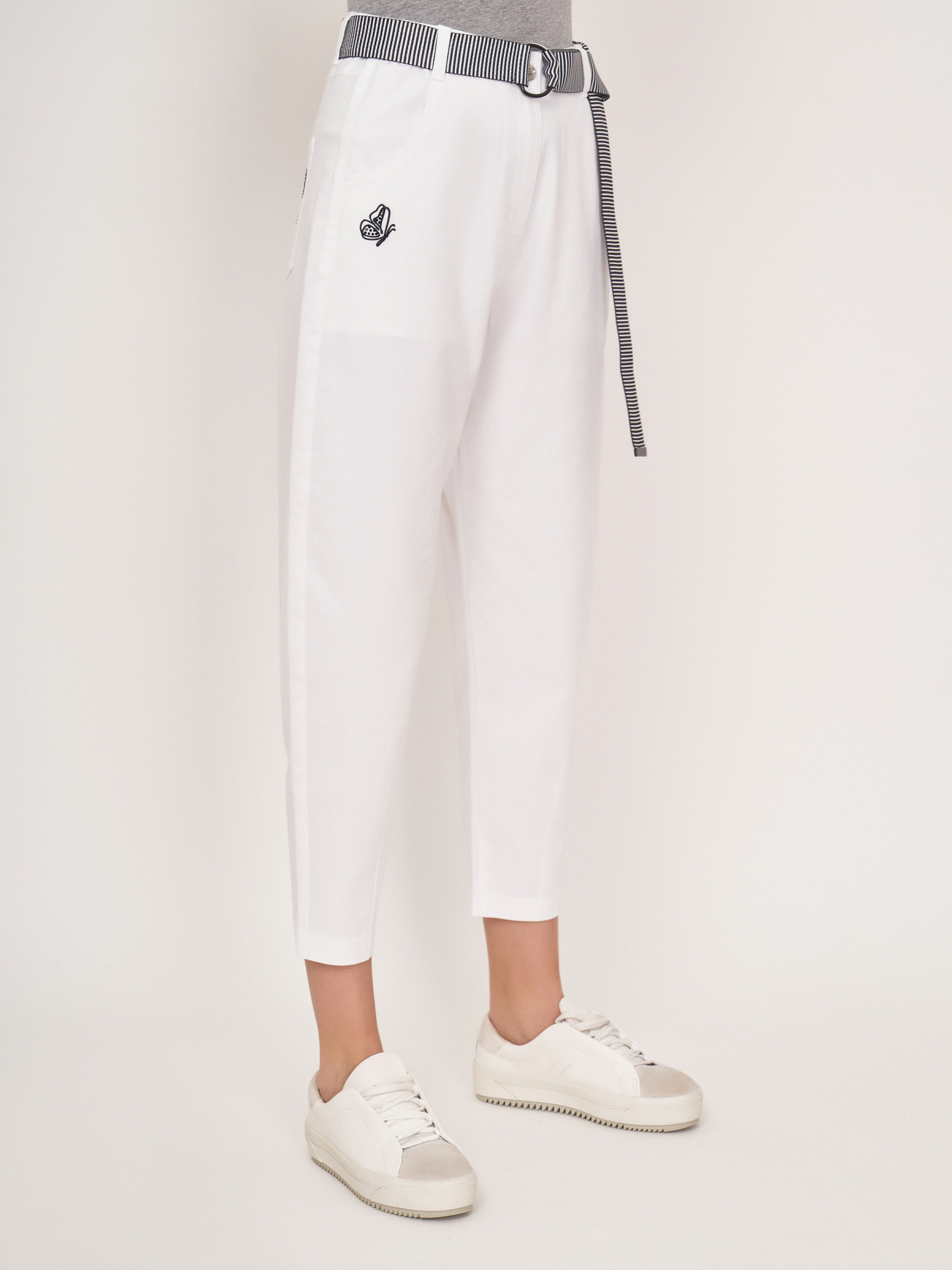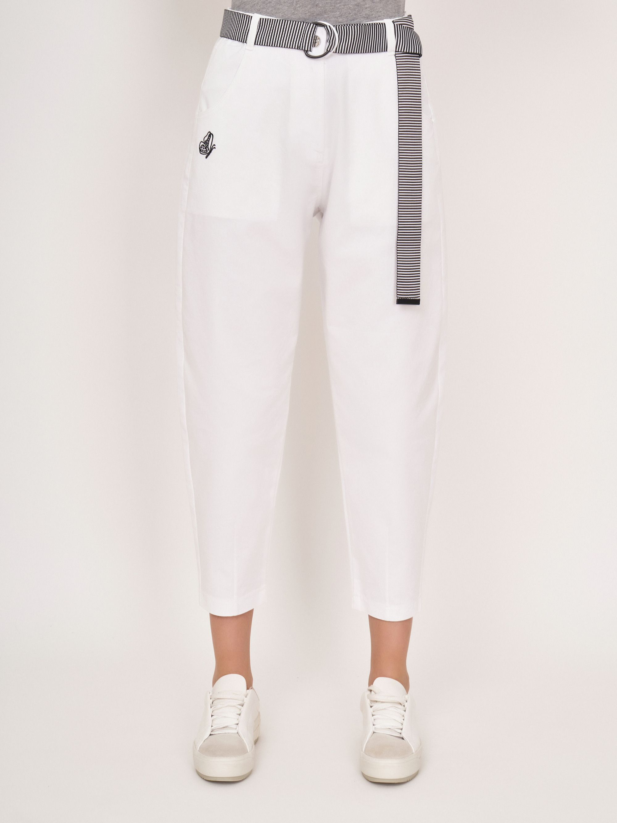 На сайте указаны российские размеры. Зауженные белые брюки бойфренды на молнии, с косыми и накладными карманами, с текстильным поясом, с рисунком бабочка. Длина брюк: 66 см. Рост модели: 177 см.