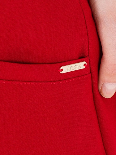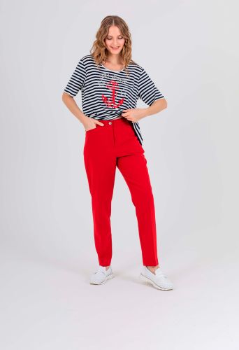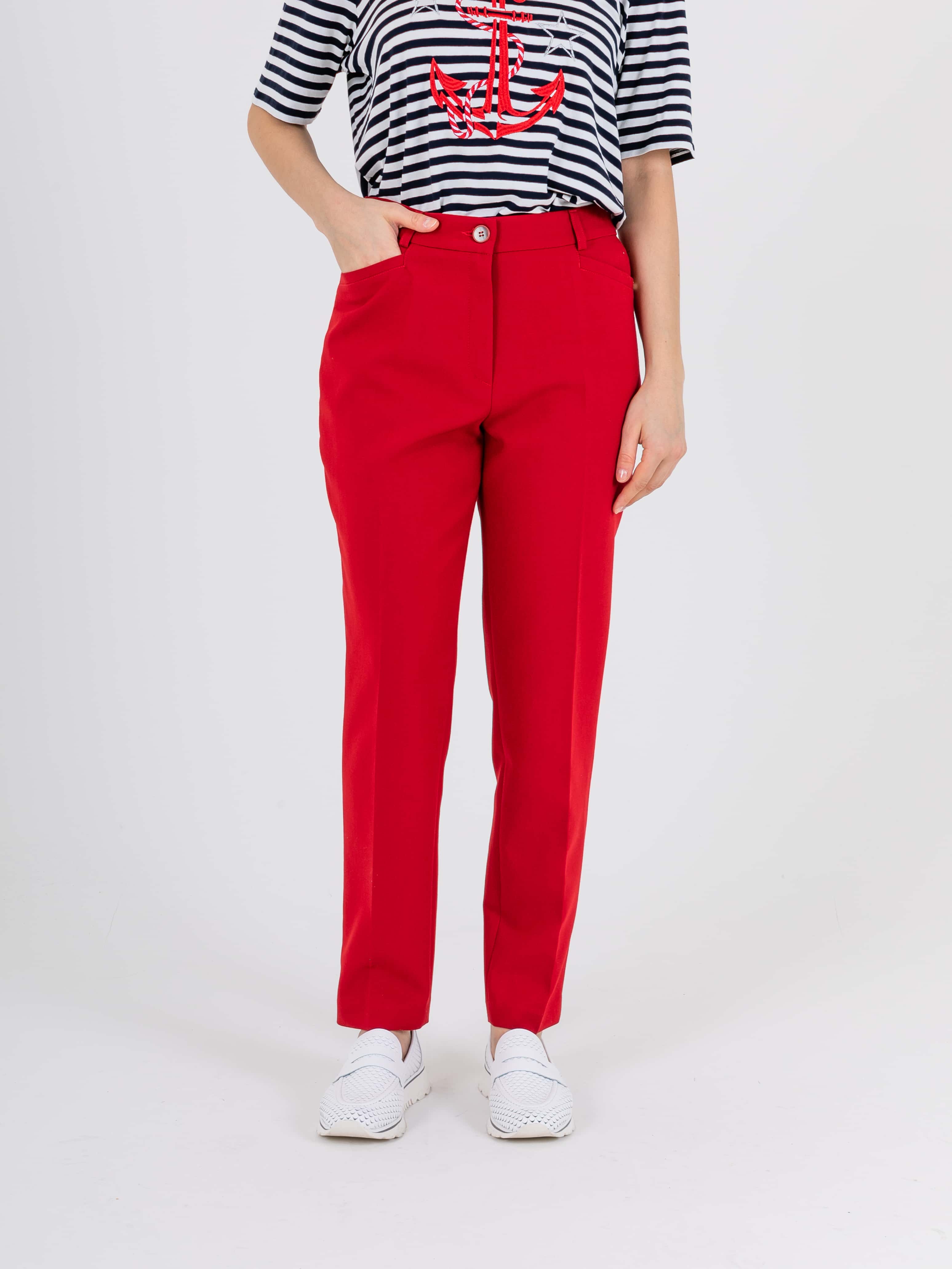На сайте указаны российские размеры. Прямые брюки с завышенной талией длиной до щиколотки с застежкой на молнию и 1 пуговицу. Брюки слегка зауженные книзу. На передних половинках расположены два кармана с отрезным бочком и листочкой. На правой задней половинке прорезной карман с листочкой, прорезной петлей и пуговицей, для фиксации кармана. Верх брюк обработан поясом со шлевками.