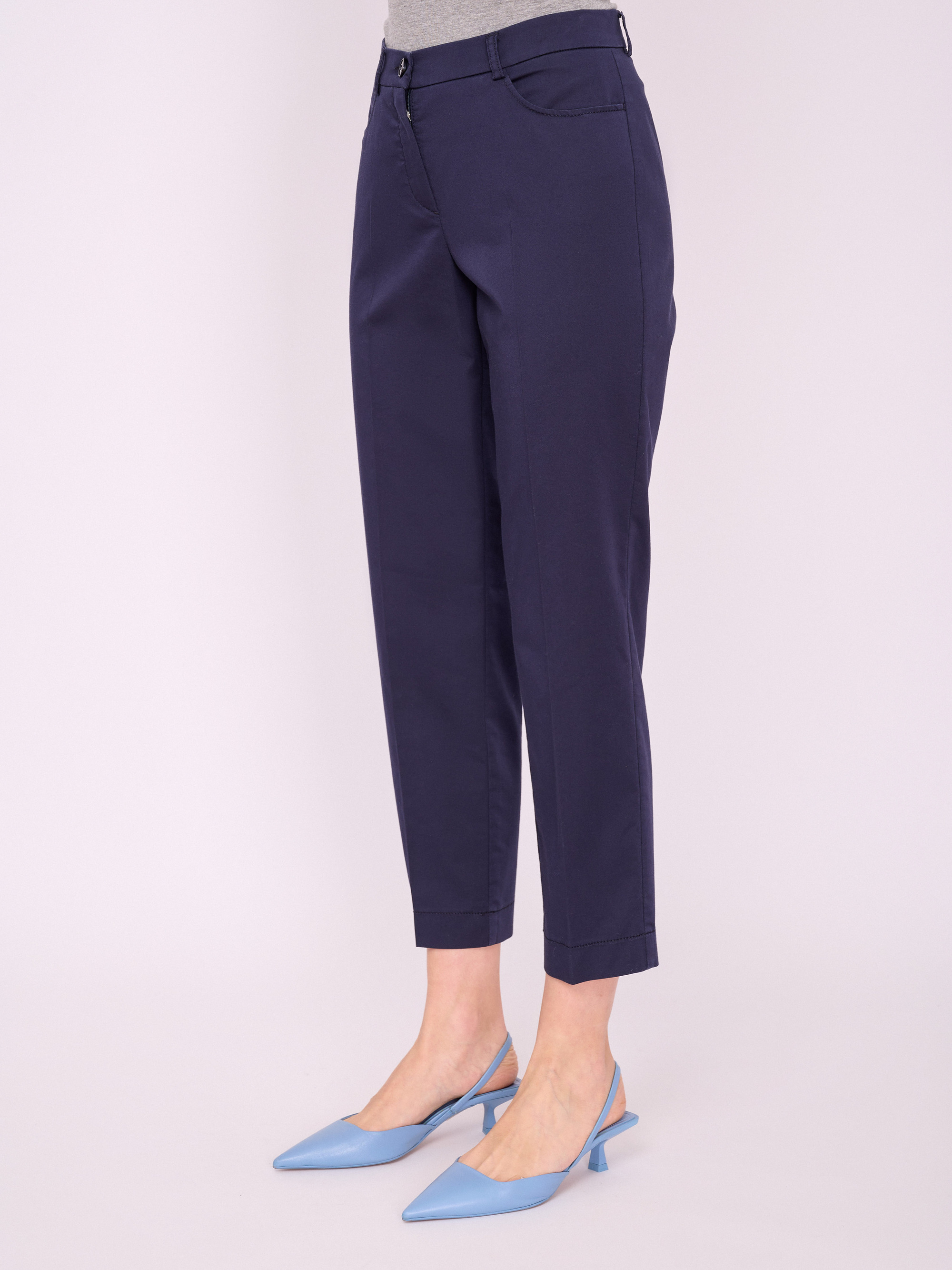 На сайте указаны российские размеры. Зауженные укороченные брюки на молнии, со стрелками и карманами с отрезным бочком. Длина брючин: 68 см. Рост модели 175 см.