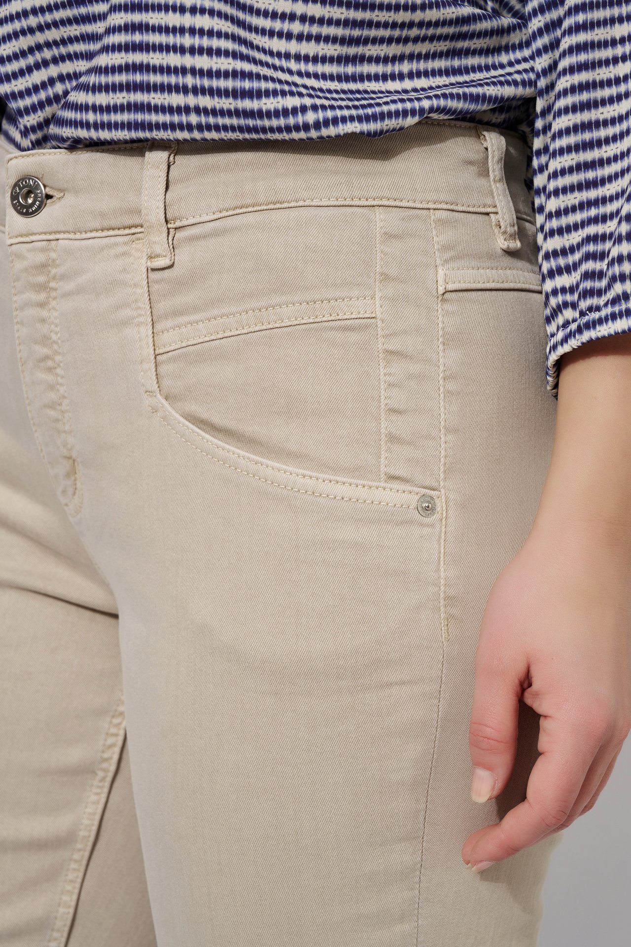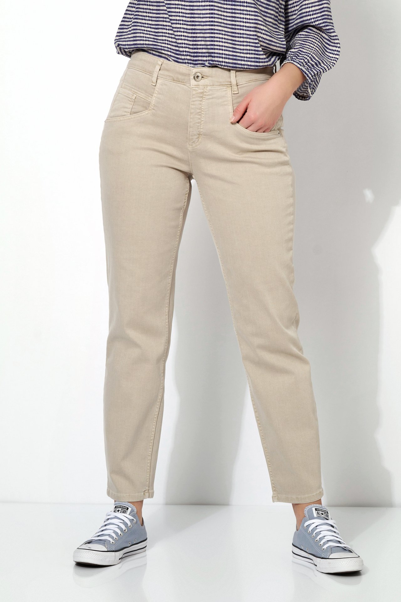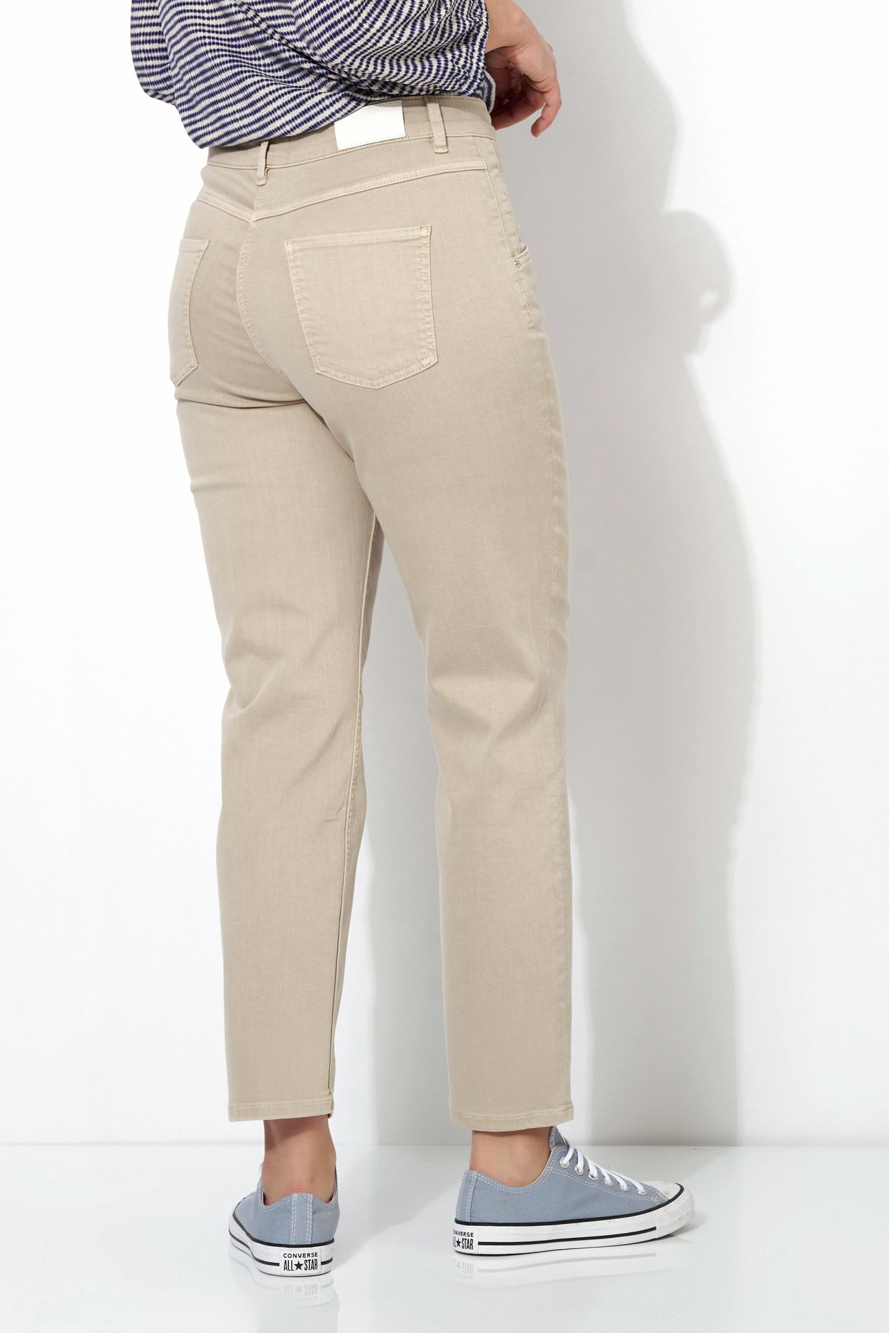 На сайте указаны российские размеры. Летние джинсы средней посадки с изысканным решением карманов, средней высоты поясом, длиной до щиколотки и прямой посадкой. Рост модели 178 см.