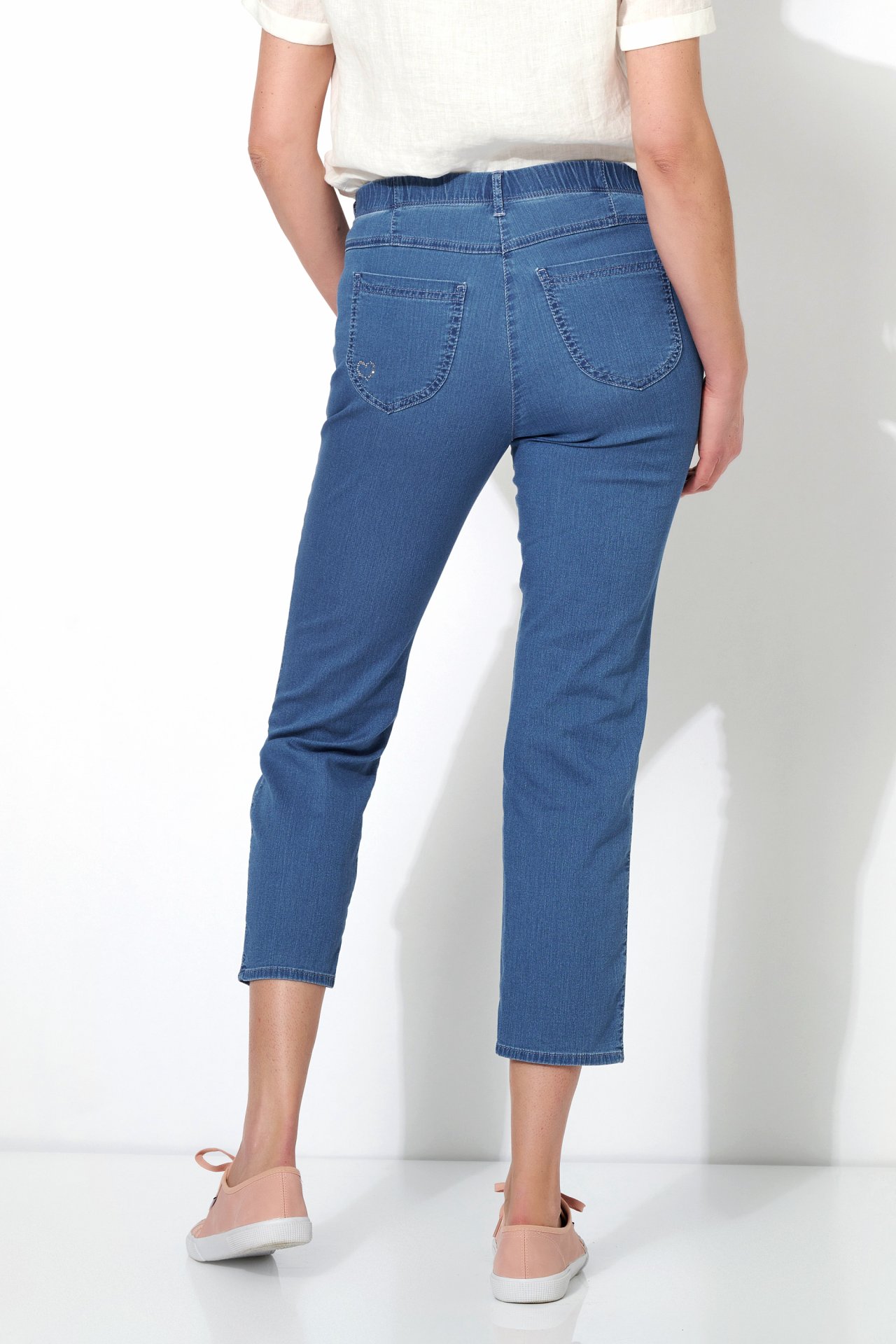 На сайте указаны российские размеры. Повседневные джинсы с пятью карманами из легкого эластичного хлопка с невидимой резинкой, аппликацией в виде сердца на заднем кармане и свободной посадкой. Длина по внутреннему шву: 72 см. Рост модели 180 см.