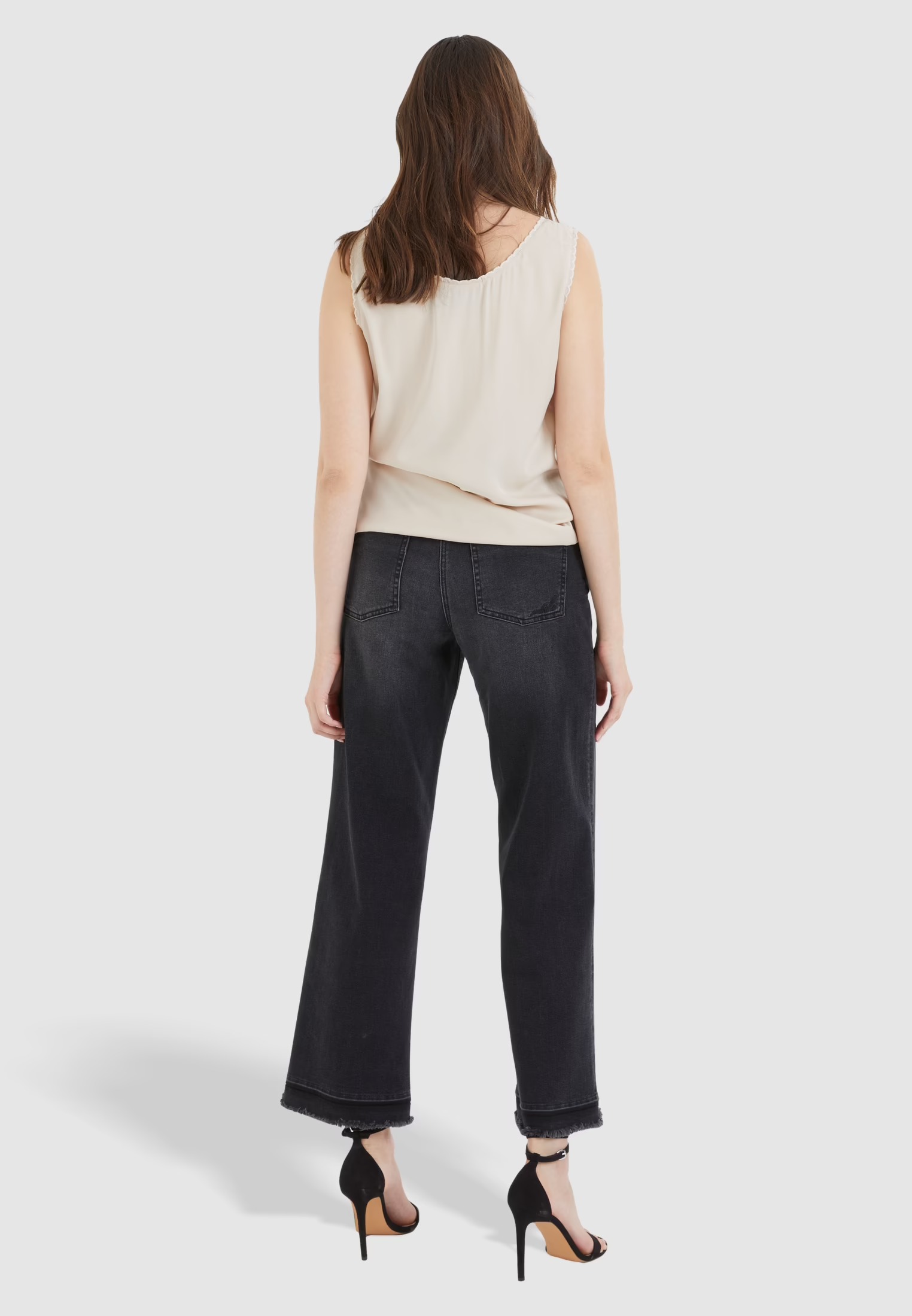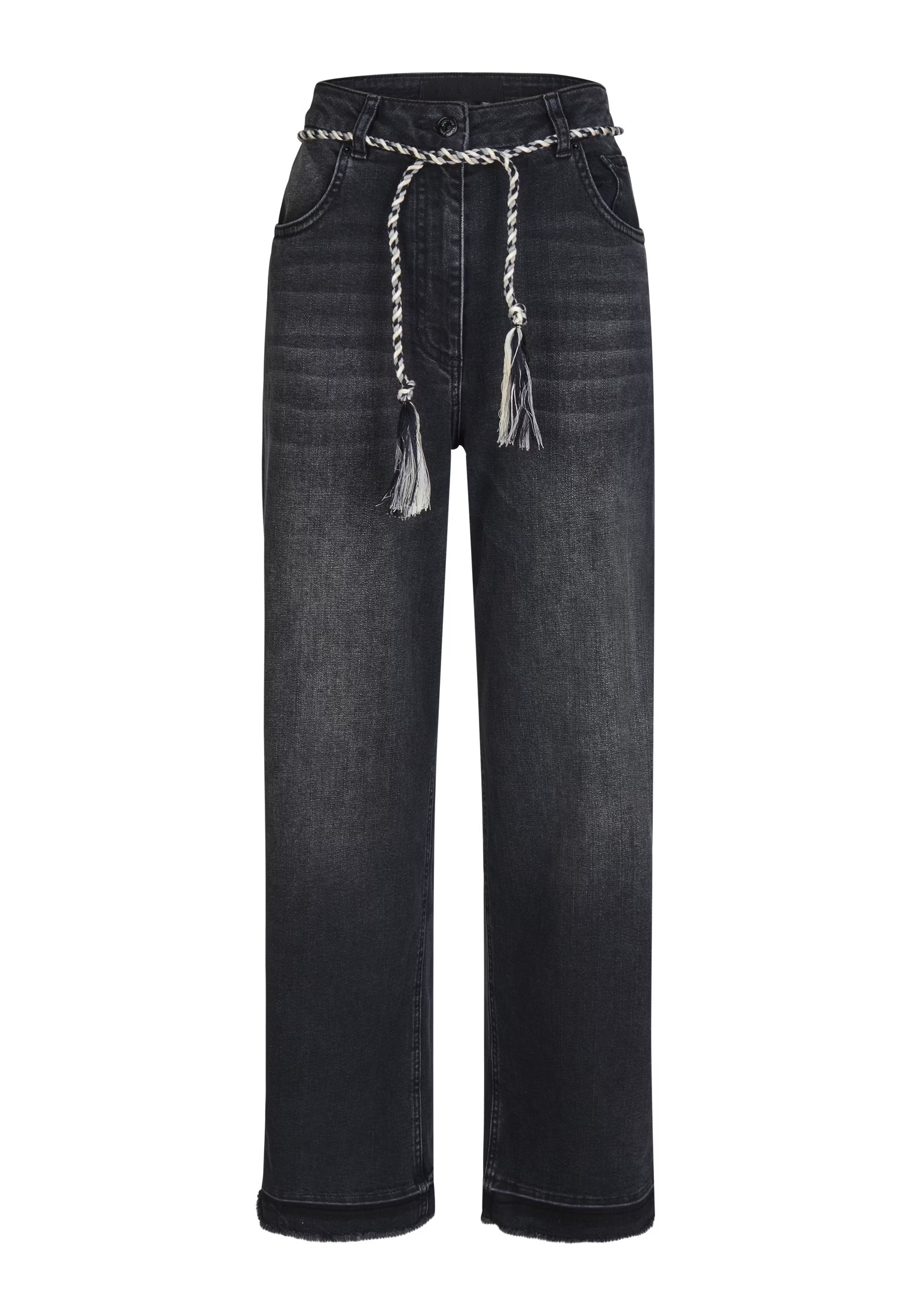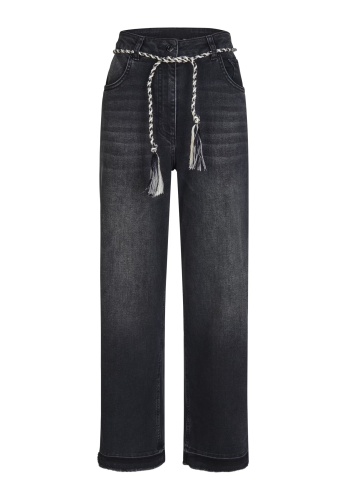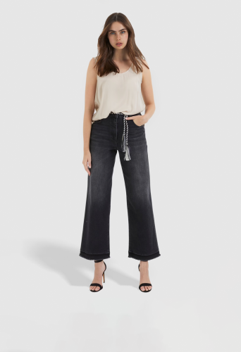 На сайте указаны российские размеры. Изготовленные из мягкой и прочной черной джинсовой ткани, эти джинсы привлекают внимание модным заниженным краем и съемной кулиской. Модель широкого кроя с пятью карманами отличается свободным кроем и высокой талией.
