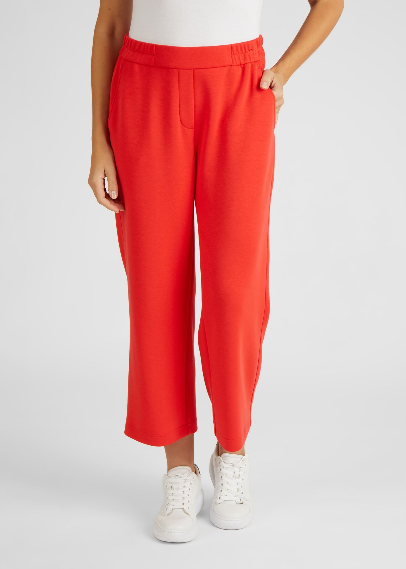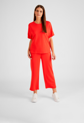 На сайте указаны российские размеры. Брюки из трикотажа имеют классический прямой крой, а эффектный цвет делает их по-настоящему привлекательными. Мягкая смесь трикотажа и вискозы придает модели особенно высокий уровень комфорта. Боковые карманы создают повседневный образ. Длина штанины по внутренней стороне для размера 46: 64 см. Рост модели 176 см.