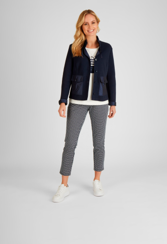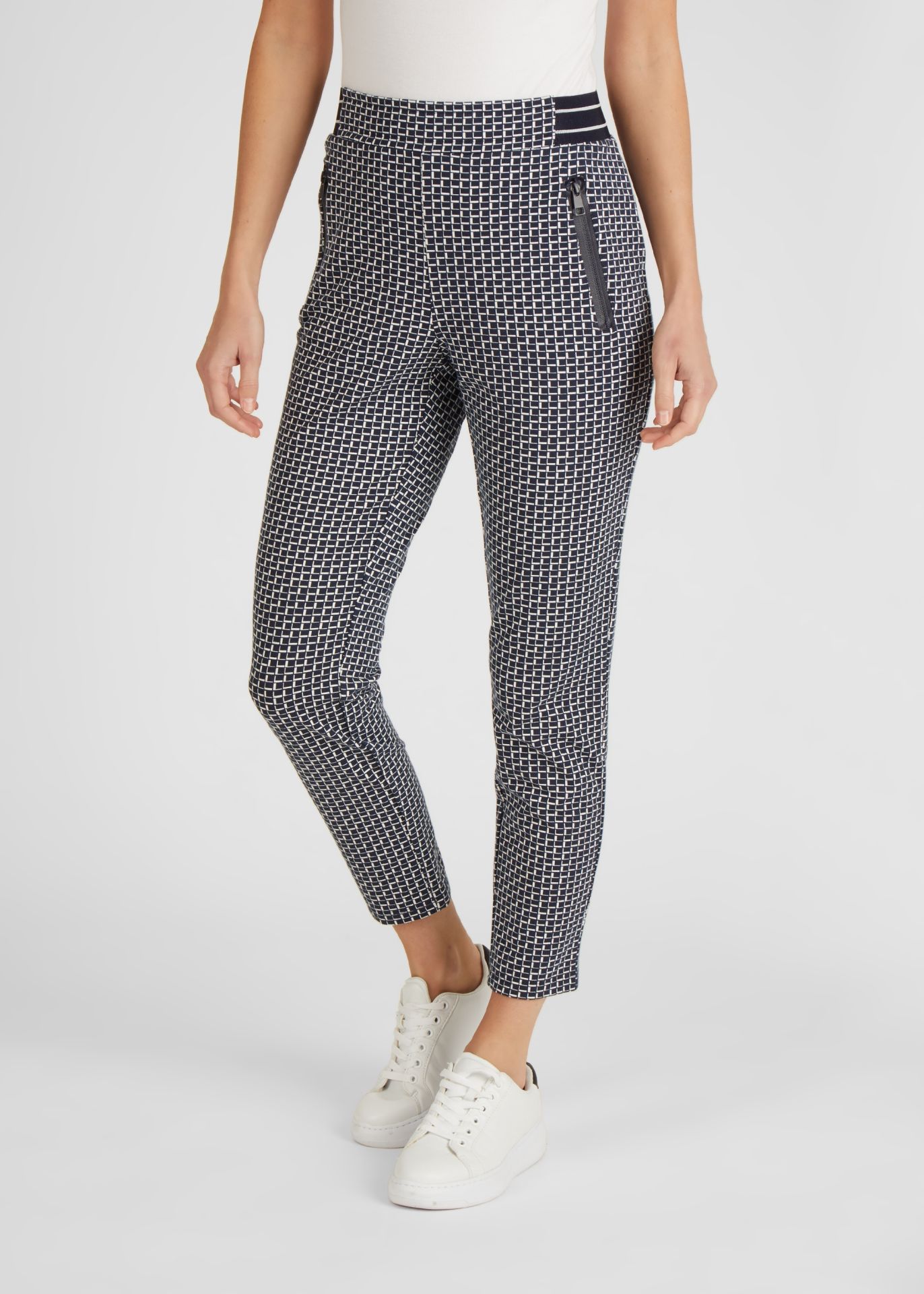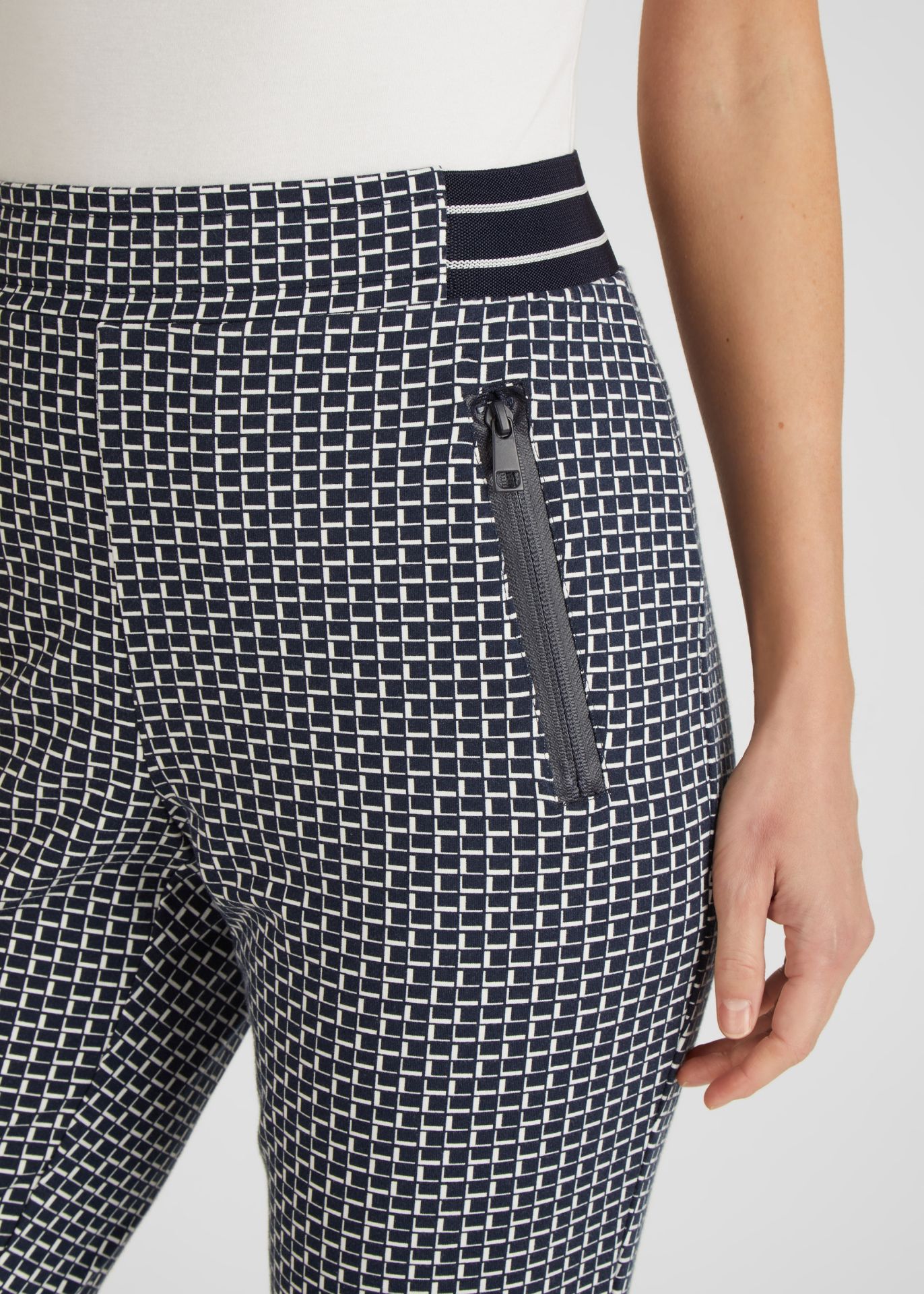 На сайте указаны российские размеры. Узкие эластичные брюки впечатляют своим современным графическим рисунком. Практичные карманы на молнии и эластичный пояс завершают модный образ. Эти брюки являются абсолютным must-have этого сезона. Длина штанины по внутренней стороне для размера 46: 69 см. Рост модели 176 см.