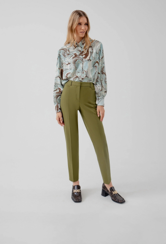 На сайте указаны российские размеры. Классические брюки со стрелками прямого силуэта на притачном поясе со шлевками и рабочими карманами по бокам фигурной формы. Застежка спереди на молнию и крючок. Сзади прорезные карманы с листочками. Рост модели 175 см.