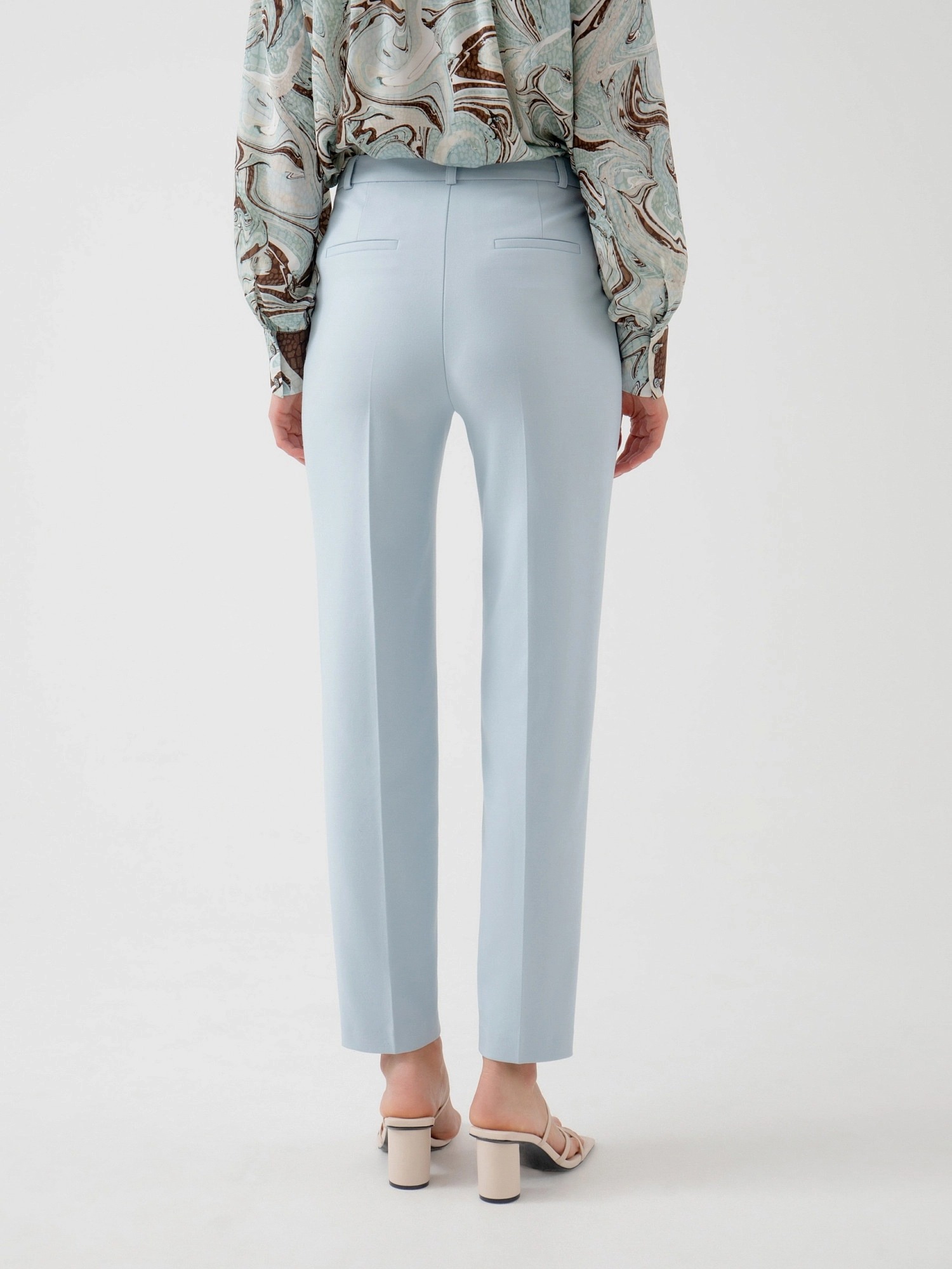 На сайте указаны российские размеры. Брюки со стрелками из костюмной ткани зауженного к низу силуэта на притачном поясе со шлевками. Спереди боковые карманы и застежка на молнию и крючок. Рост модели 175 см.