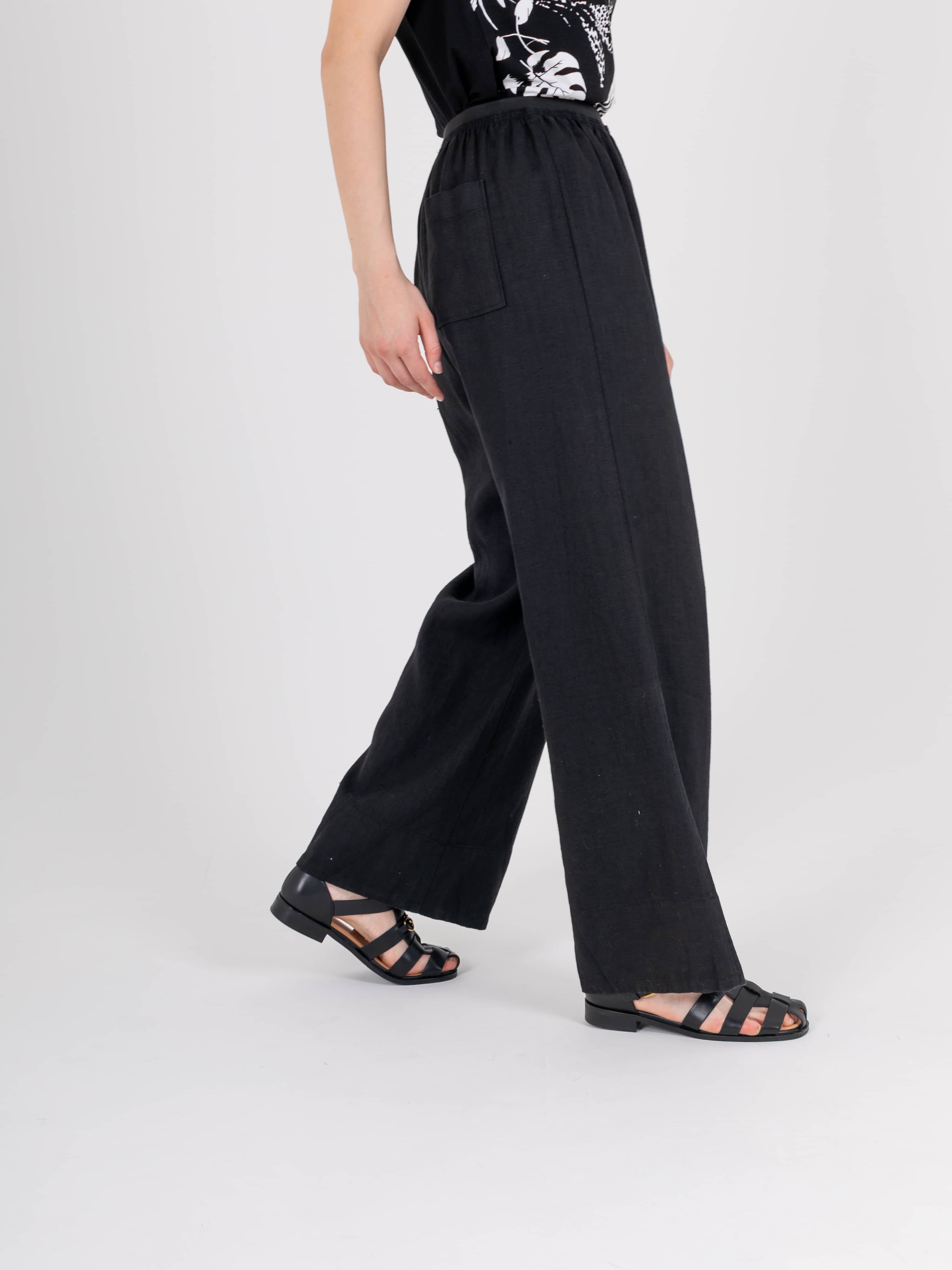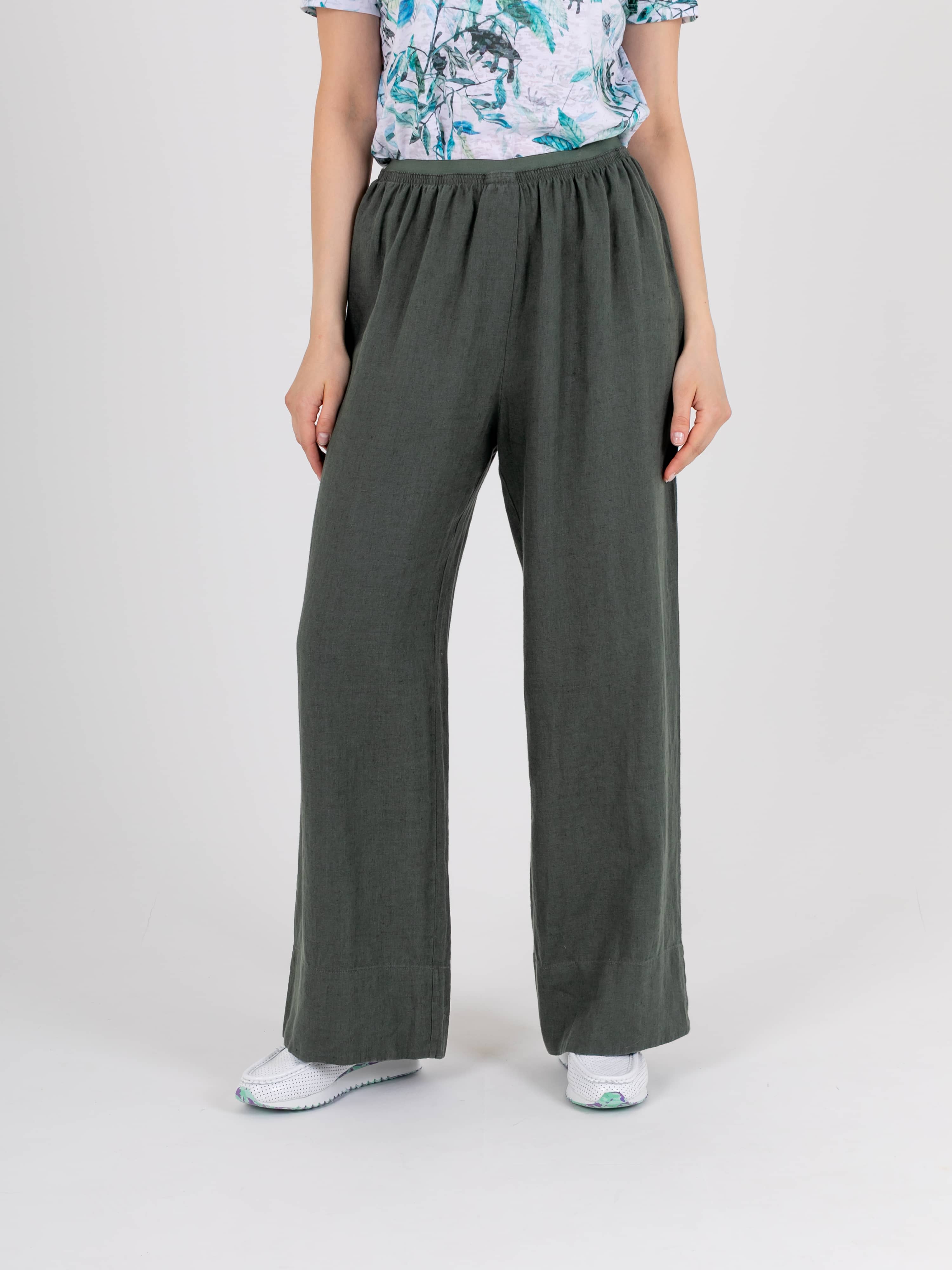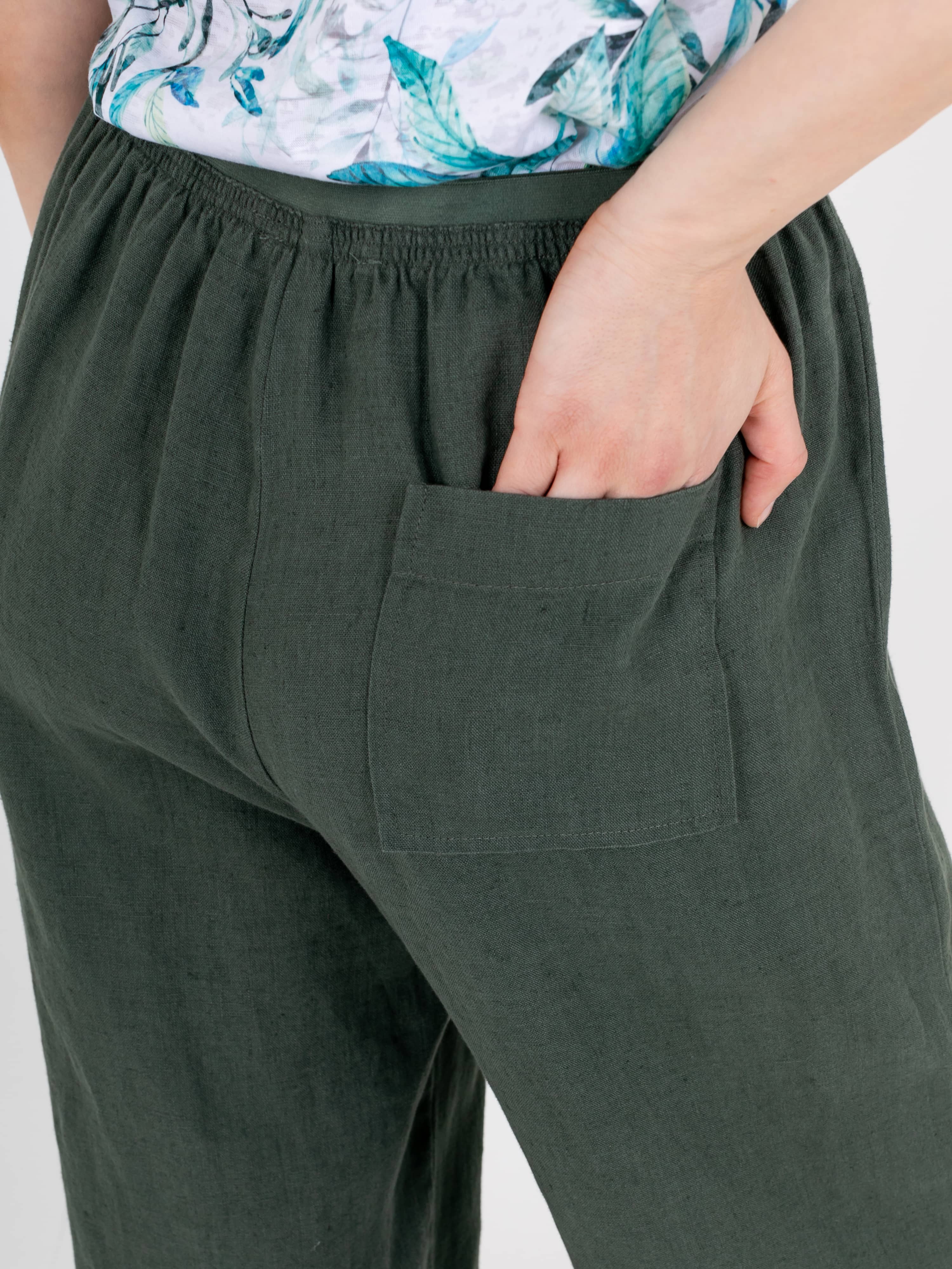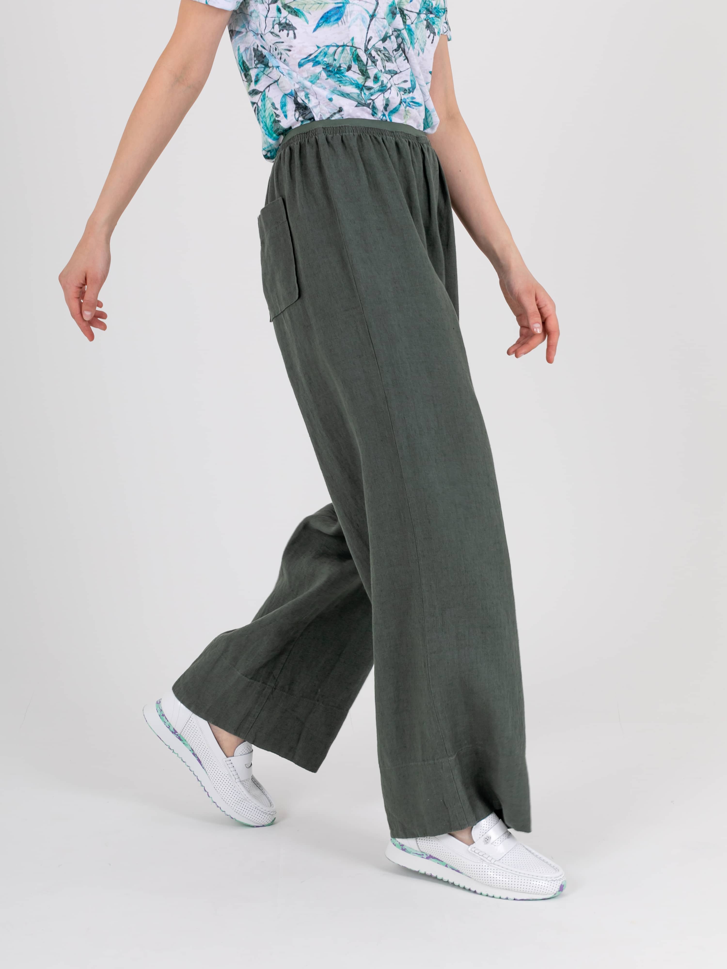 Прямые удлиненные брюки «трубы» из натурального льна. На правой задней половинке брюк расположен накладной карман. Верх брюк на резинке.