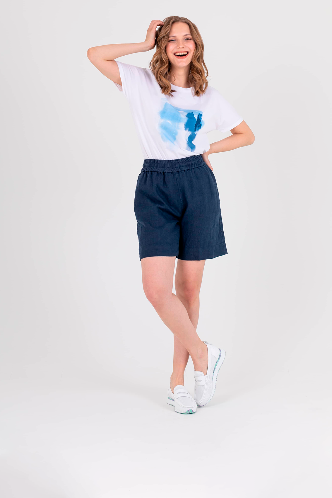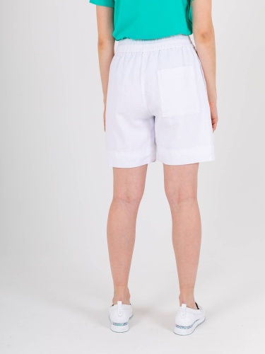 Прямые шорты-бермуды, длиной выше колен из натурального льна без застежки с карманами в боковых швах. На правой задней половинке накладной карман. Верх шорт обработан поясом на резинке.