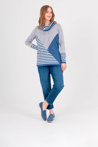 Джинсы «Basic» с завышенной талией длиной до щиколотки с имитацией гульфика без застежки. Джинсы слегка зауженные книзу, с легким варёным эффектом. На передних половинках расположены два кармана с отрезным бочком. На задних половинках два накладных кармана. Верх брюк обработан поясом на резинке со шнуром и металлическими наконечниками.
