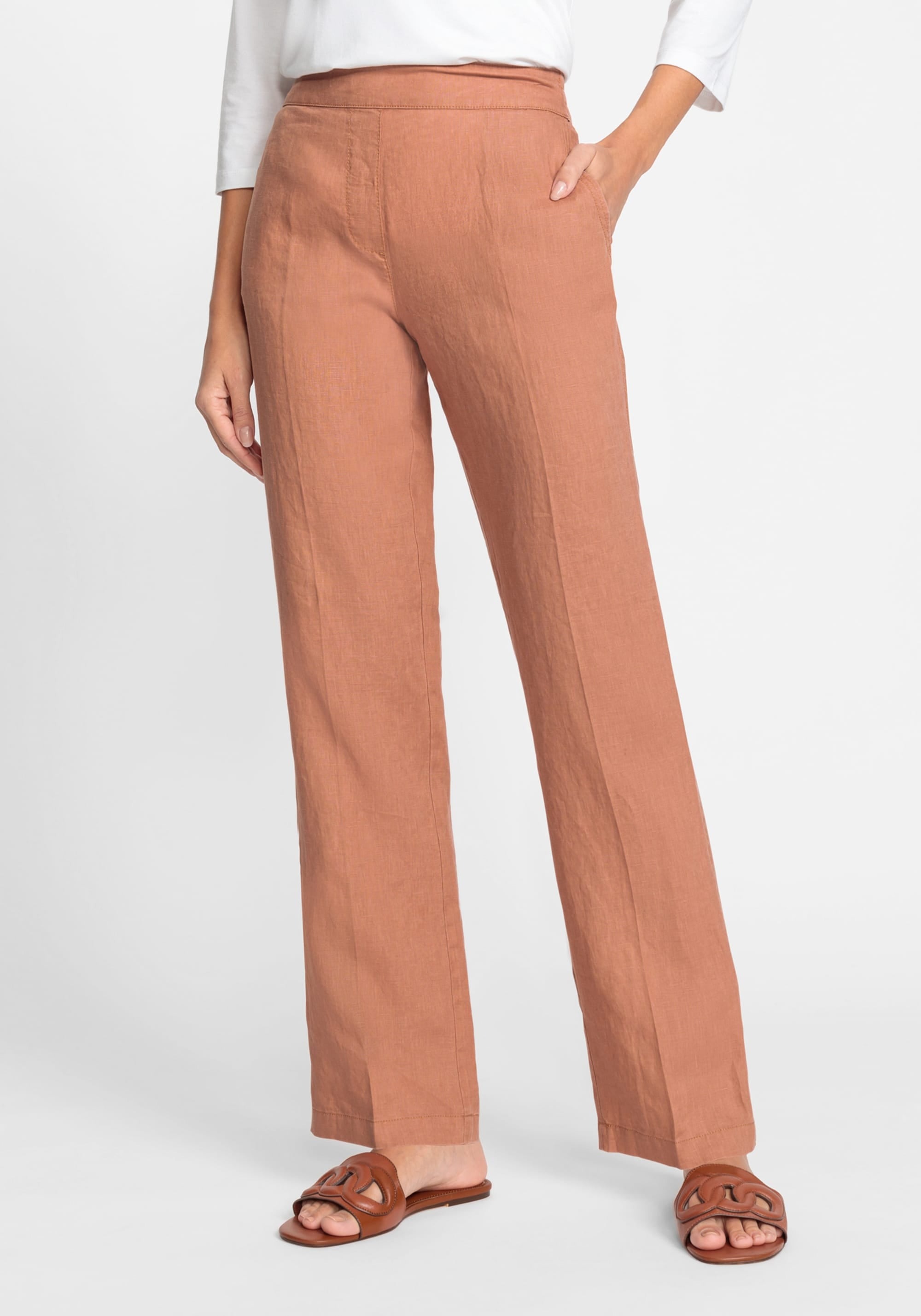 Брюки с передним и задним эластичным поясом, передними прорезными карманами и задними прорезными карманами. Изготовлено из любимого сезоном натурального волокна, чистого льна, обеспечивающего роскошный, дышащий комфорт и долговечность. Свободная посадка на бедре и посадка на естественной линии талии для эффекта удлинения ног.