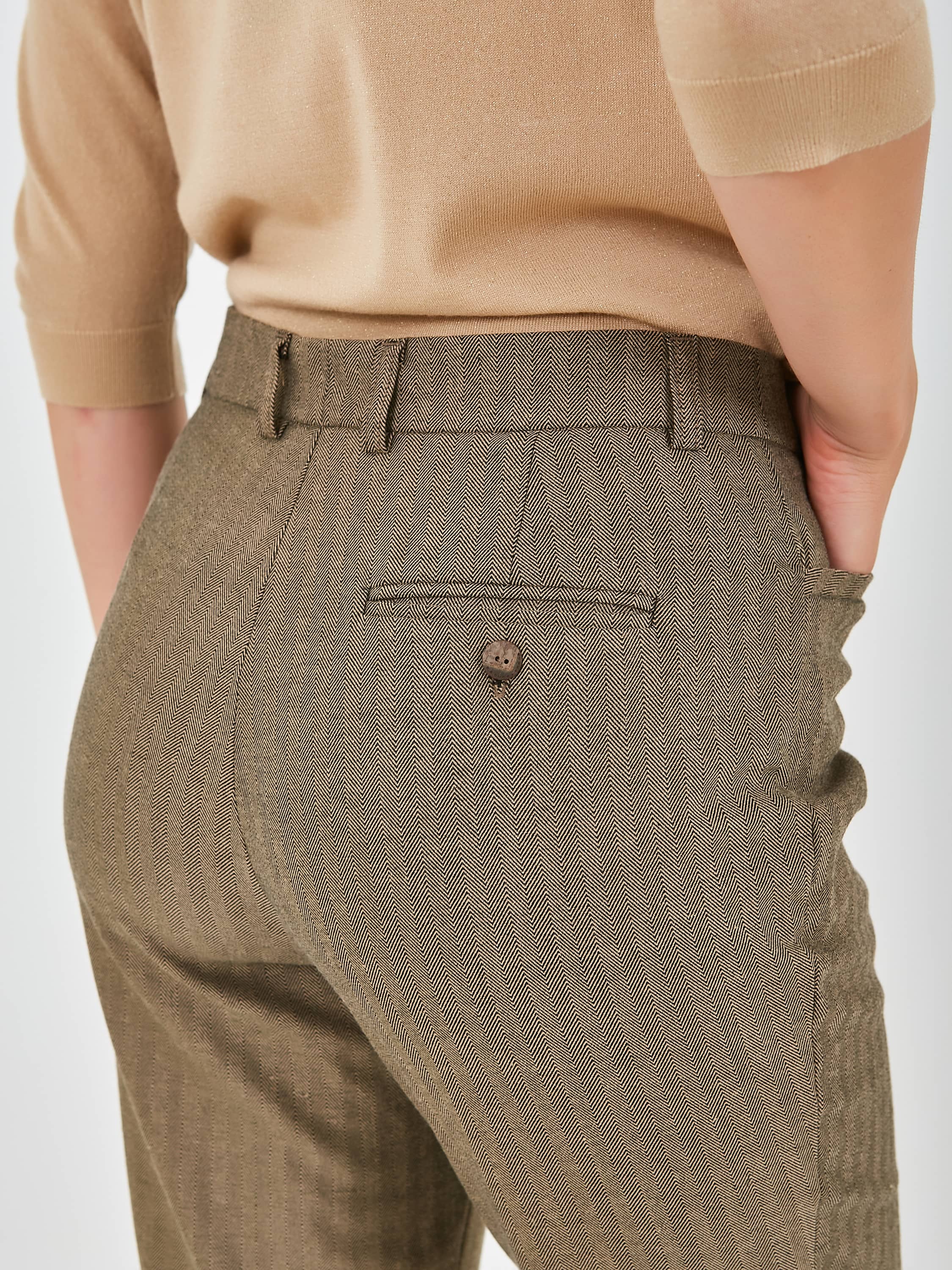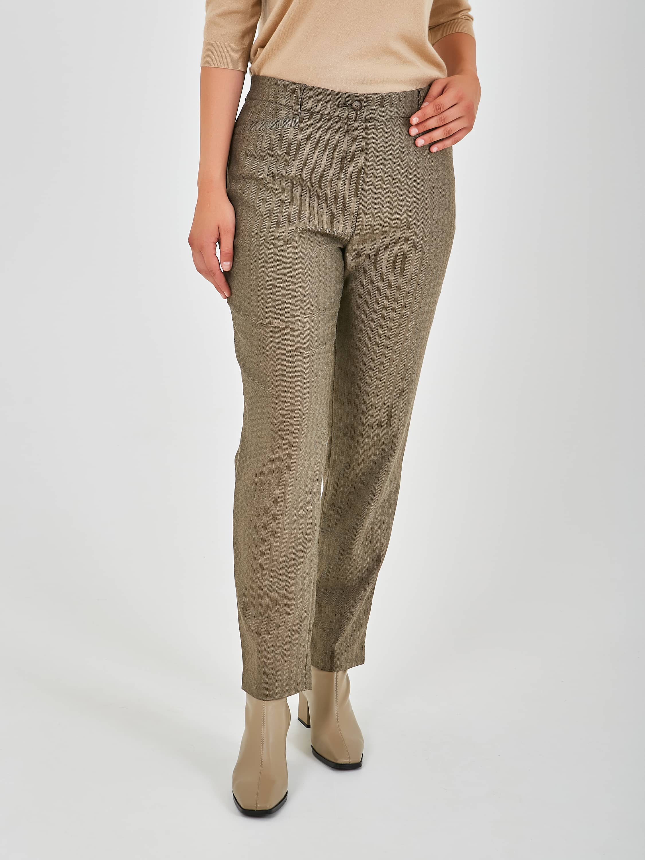 Длинные прямые брюки, с застежкой на молнию и одну пуговицу, дизайнерская особенность модели - рисунок "ёлочка". Брюки зауженные книзу. На передних половинках расположены два кармана с отрезным бочком и листочкой. На задних половинках также расположены два кармана с листочкой. Верх брюк обработан поясом и шлевками.