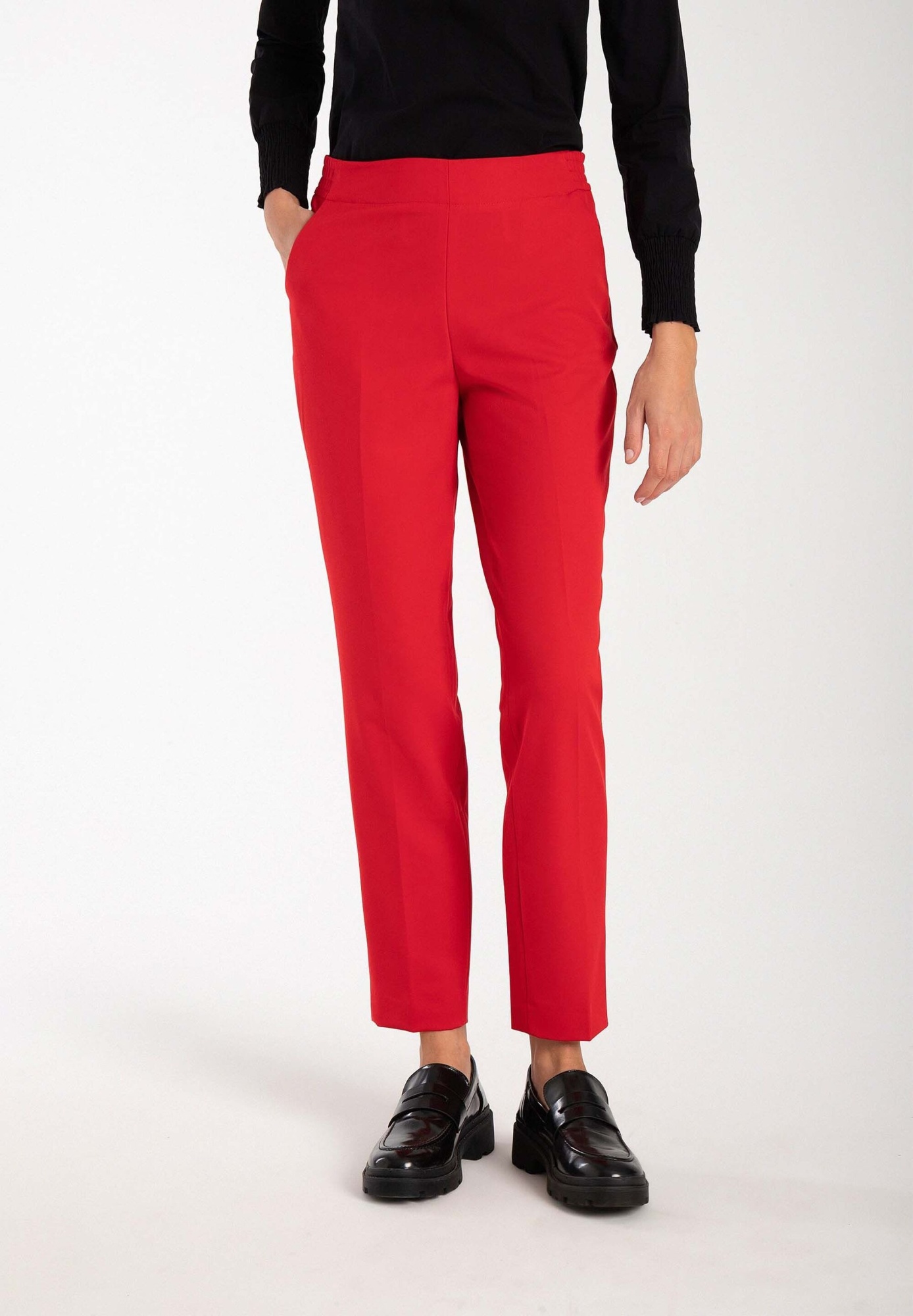 Аккуратные, несложные брюки без застежек от MORE & MORE с зажатыми складками легко сочетаются с блузками, рубашками или легким трикотажем, а в сочетании с блейзером в тон создают современный деловой образ. тонкий силуэт. Модель без застежек с эластичным поясом сзади, наклонные карманы, прессованная складка, Внутренняя длина штанины по размеру 42 = 74см