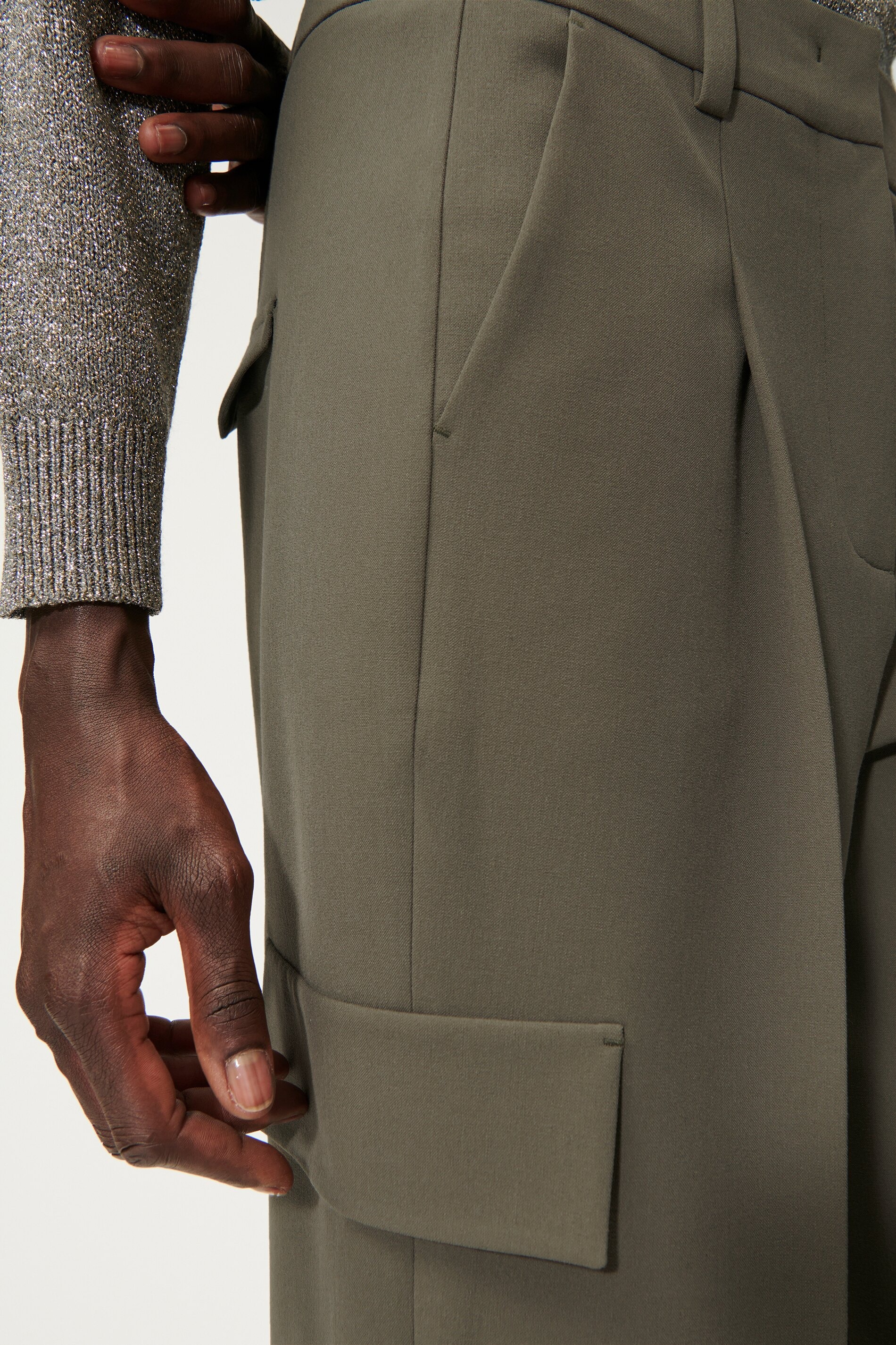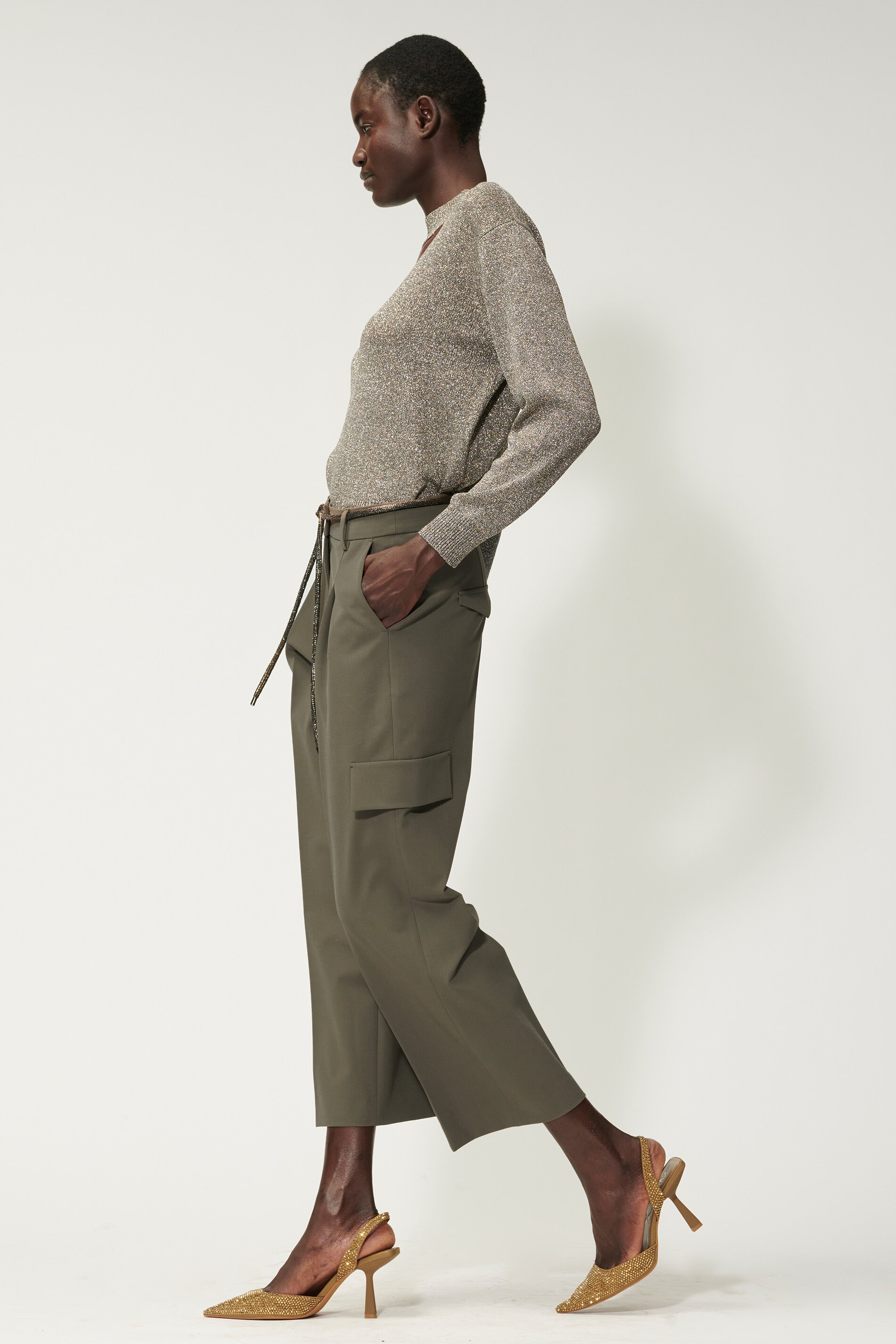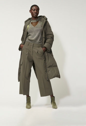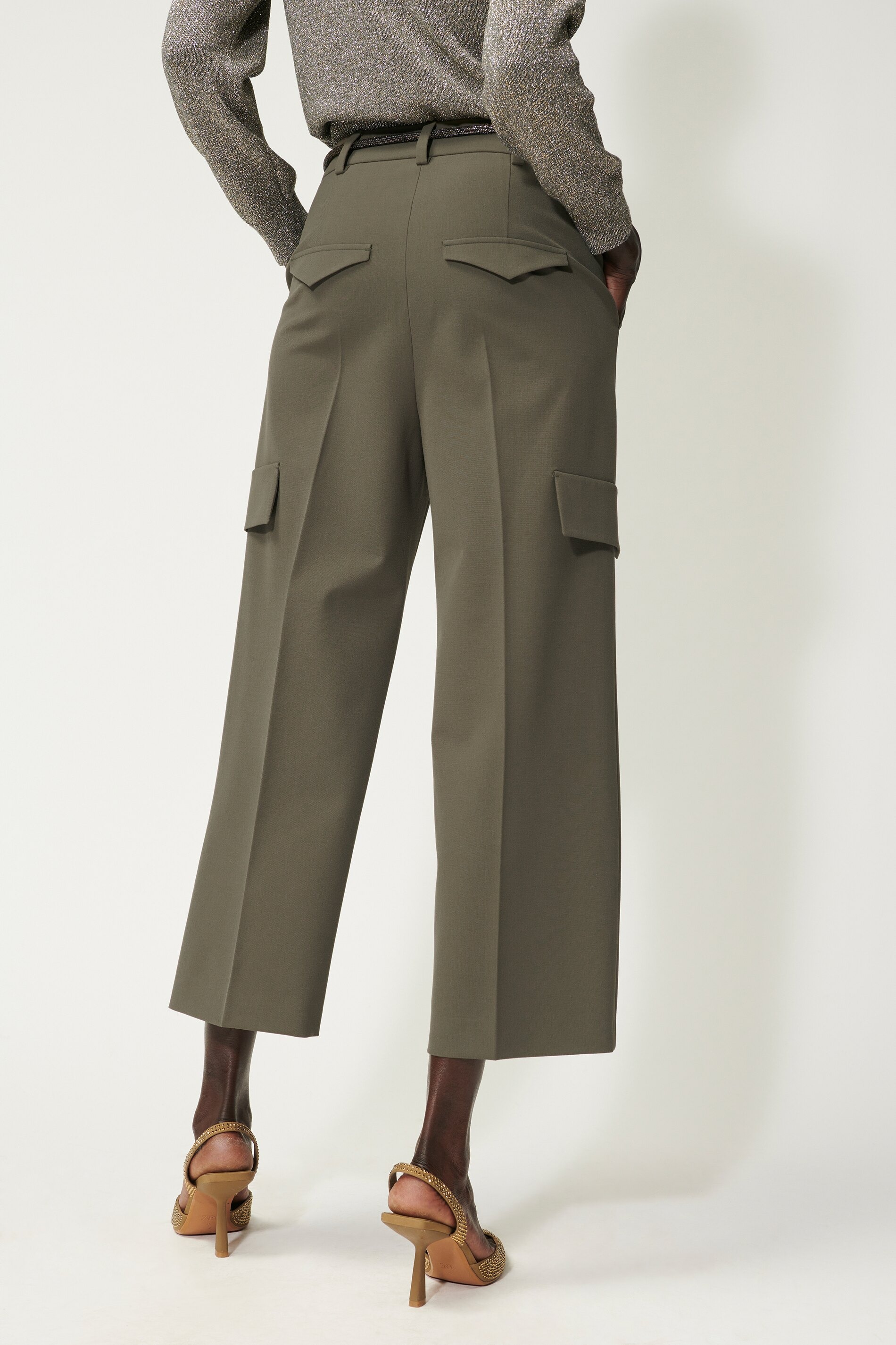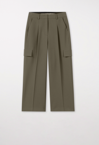 Укороченные брюки с широкими штанинами и складками из мягкой струящейся технической шерсти. Два вставных кармана, два декоративных кармана-карго и два декоративных задних кармана с клапаном придают этим брюкам типичный стиль карго.