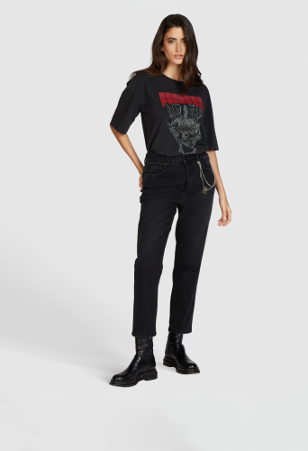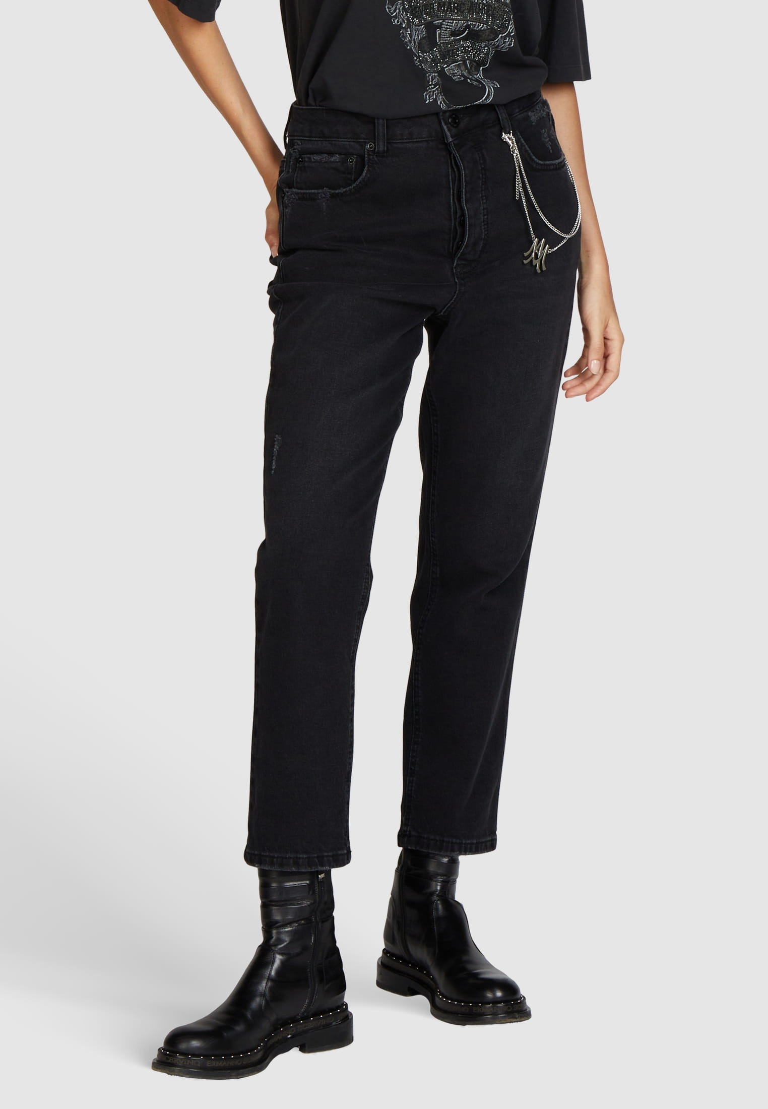 Укороченные джинсы Mom с высокой талией из комфортного черного денима. Эластичный материал не только придает им элегантный вид, но и делает их чрезвычайно удобными в ношении. Модный свободный крой с завышенной талией и укороченной длиной промежности создает вау-эффект, как и съемная ювелирная цепочка серебристого цвета с логотипом.