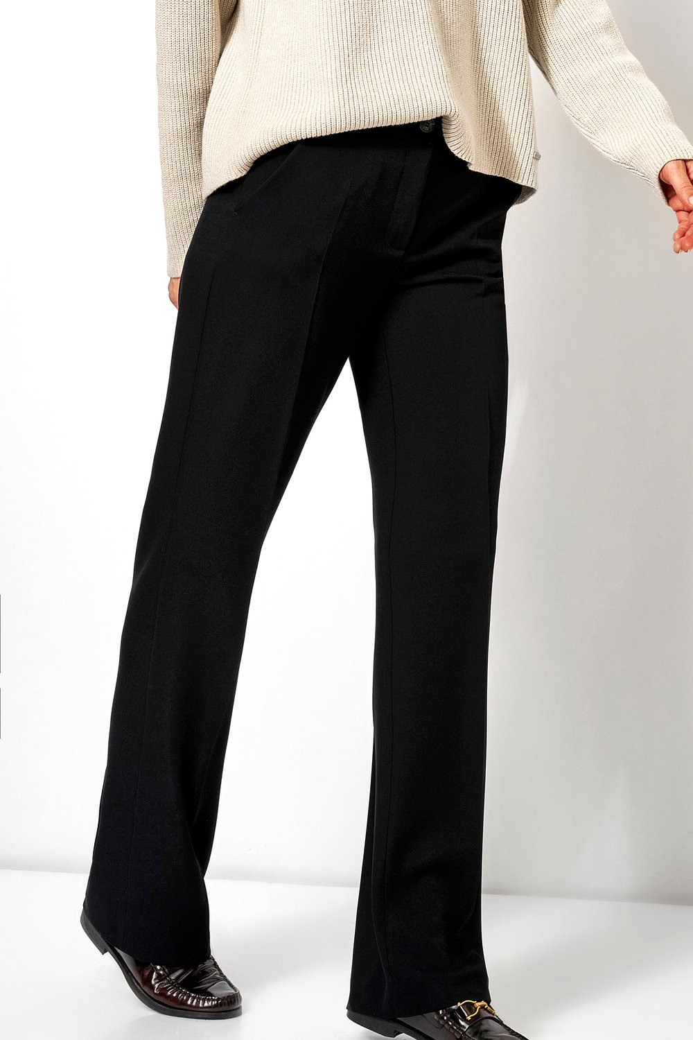 Деловые брюки с широкими штанинами, резинкой, заутюженными складками и из немнущегося материала.