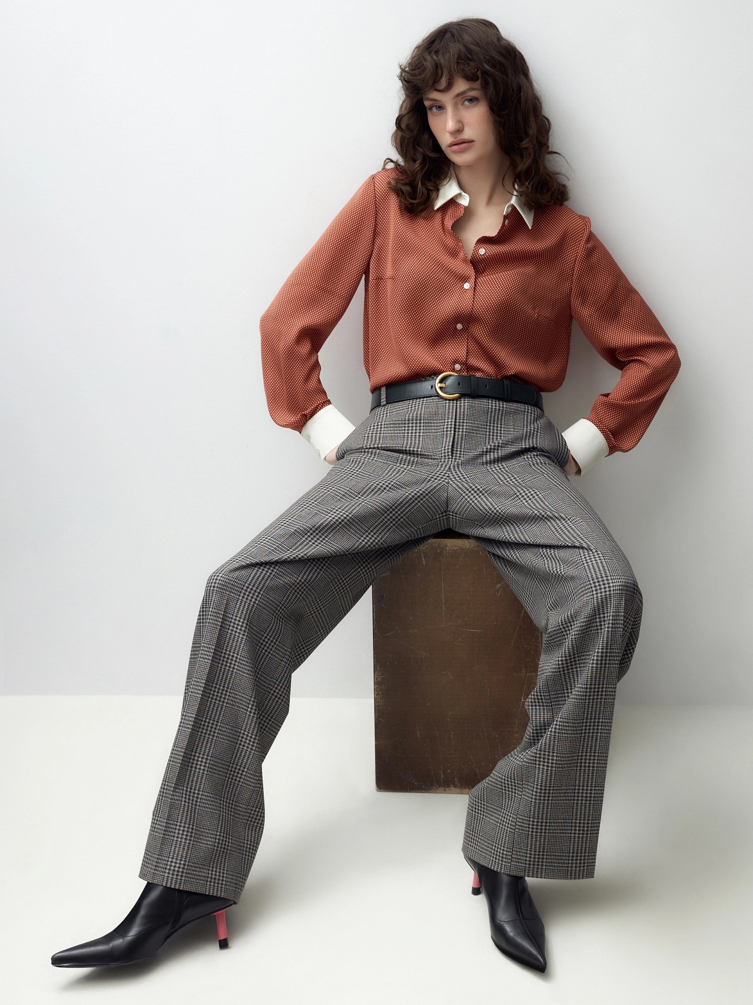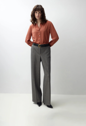 Классические прямые брюки средней посадки, со стрелками на притачном поясе с шлевками. Имеют два функциональных кармана по бокам и два прорезных кармана сзади. Брюки идеально сочетаются с жакетом из одного цветового блока. (арт. 1100110LS0190)