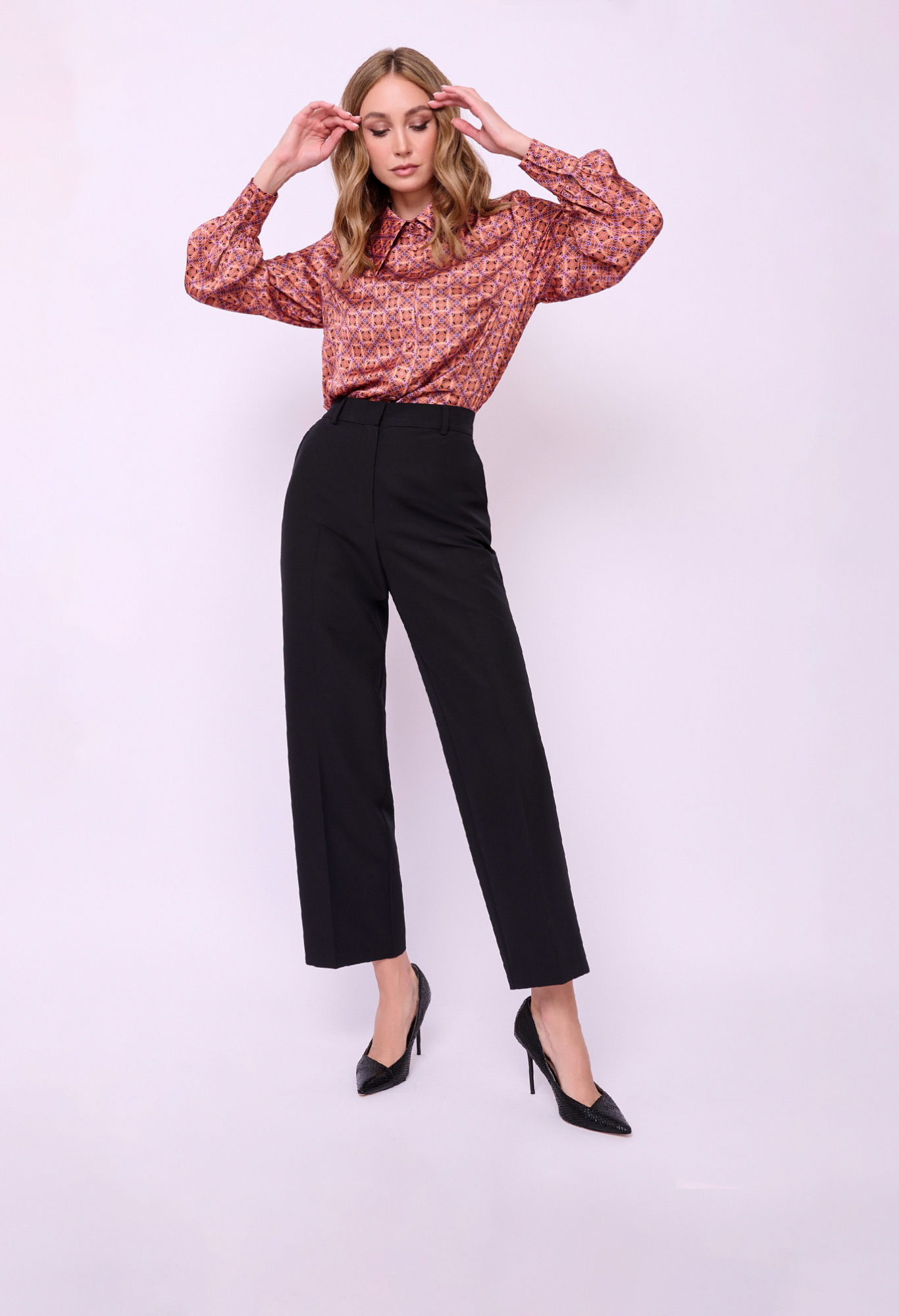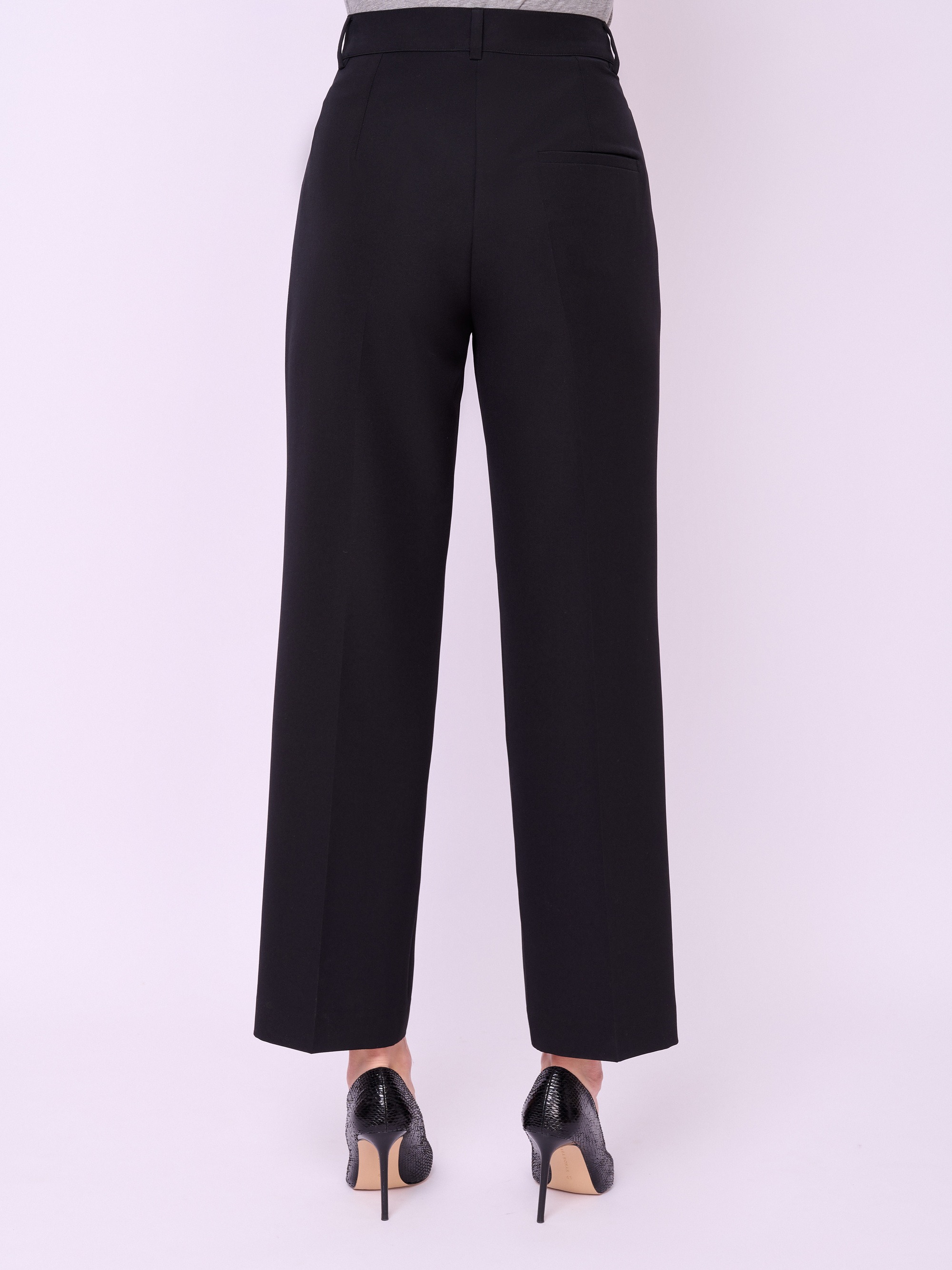 Зауженные костюмные брюки на молнии с косыми карманами, шлевками на поясе и стрелками. Длина брючин: 76 см.