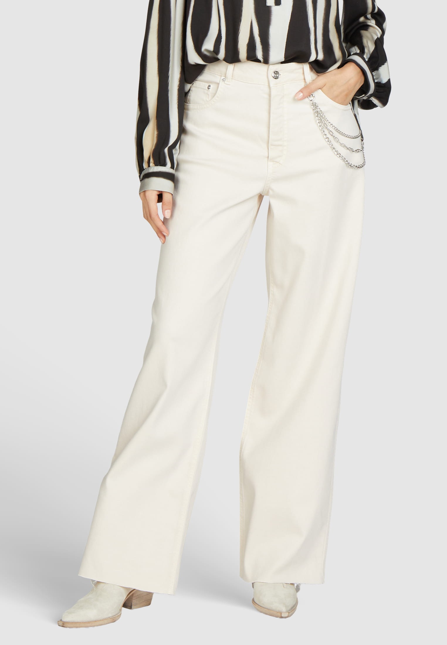 Брюки с высокой талией изготовлены из экологически чистой смеси хлопка и лиоцелла с добавлением стрейча. Свободный крой с широкими штанинами прекрасно дополняется открытым подолом, создавая непринужденный стиль. Серебряная съемная ювелирная цепочка также привлекает внимание.