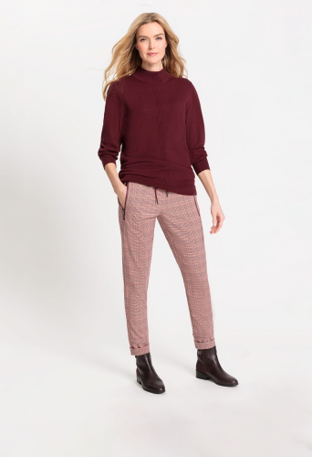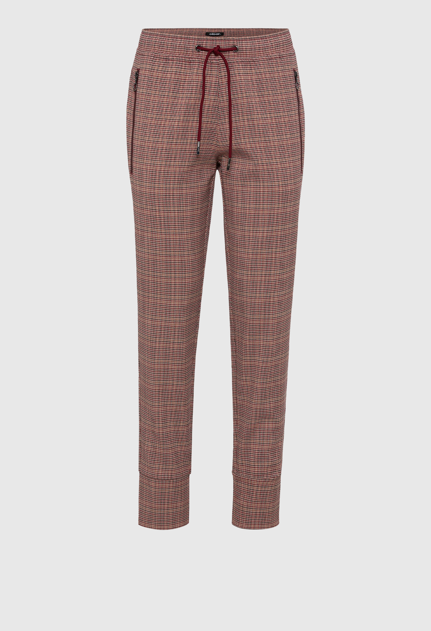 Брюки в стиле джоггеров украшены классическим рисунком «гусиные лапки» по всей поверхности. Талия на шнурке, задние прорезные карманы и боковые карманы на молнии. Подол можно застегнуть или завернуть в манжеты. Посадка расслаблена в бедрах и сидит немного ниже естественной линии талии для комфорта.