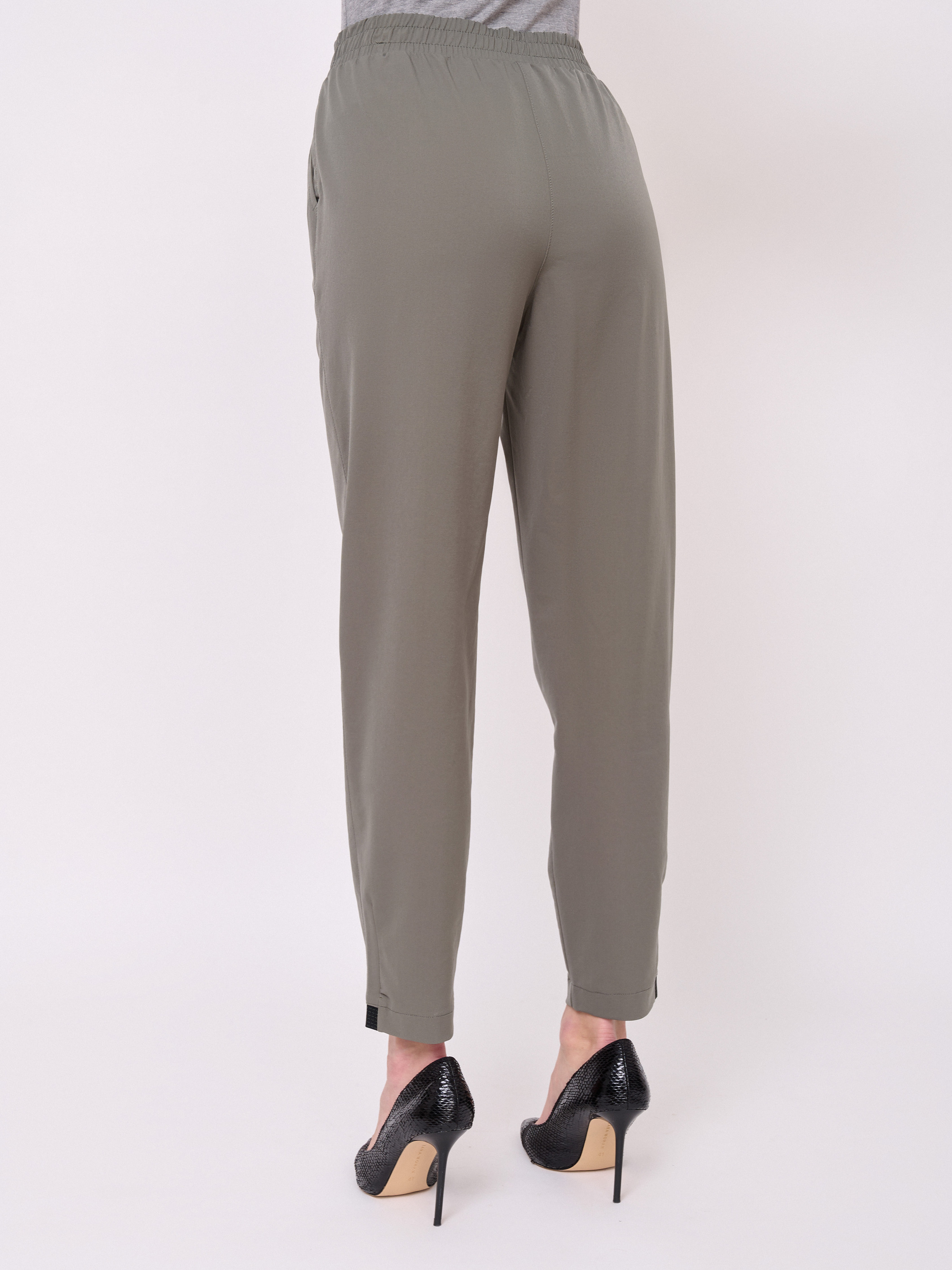 Застежка резинка, без рисунка, карманы косые, крой брючин зауженный, посадка средняя, эластичные вставки по низу брючин. Длина брючин: 72 см.