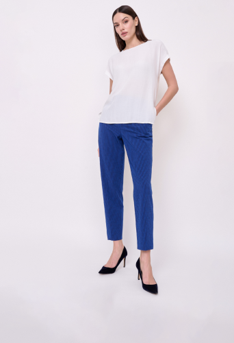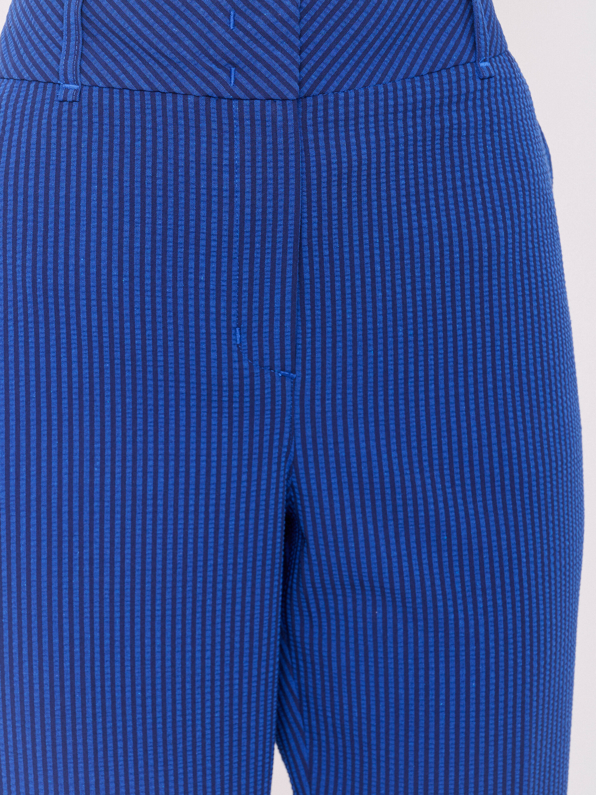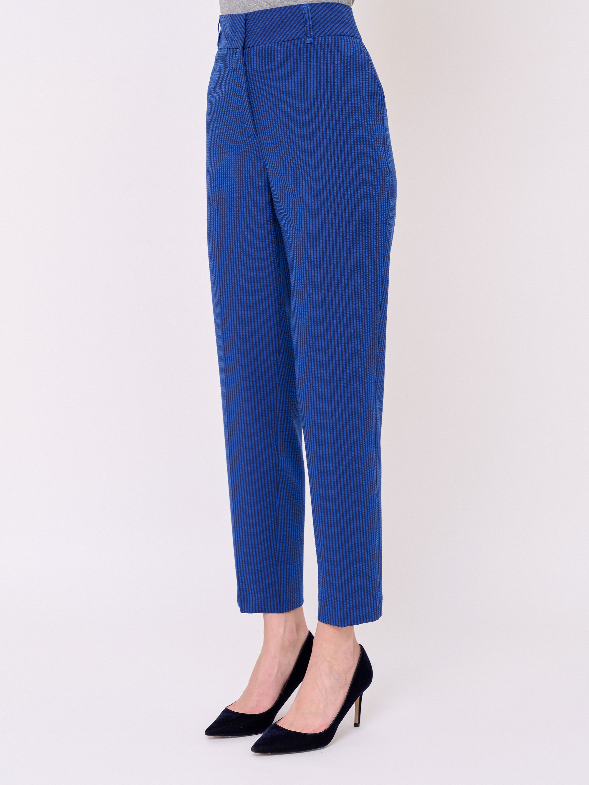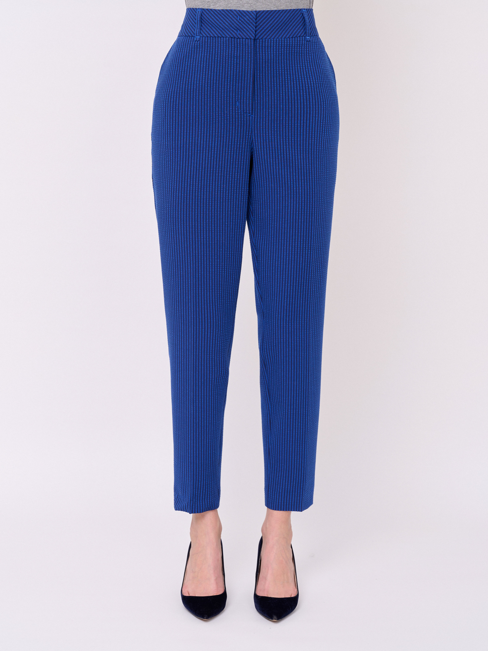 Жатая ткань, застежка молния, рисунок полоска, карманы косые, крой брючин зауженный, посадка средняя, шлевки для ремня. Длина брючин: 75 см.