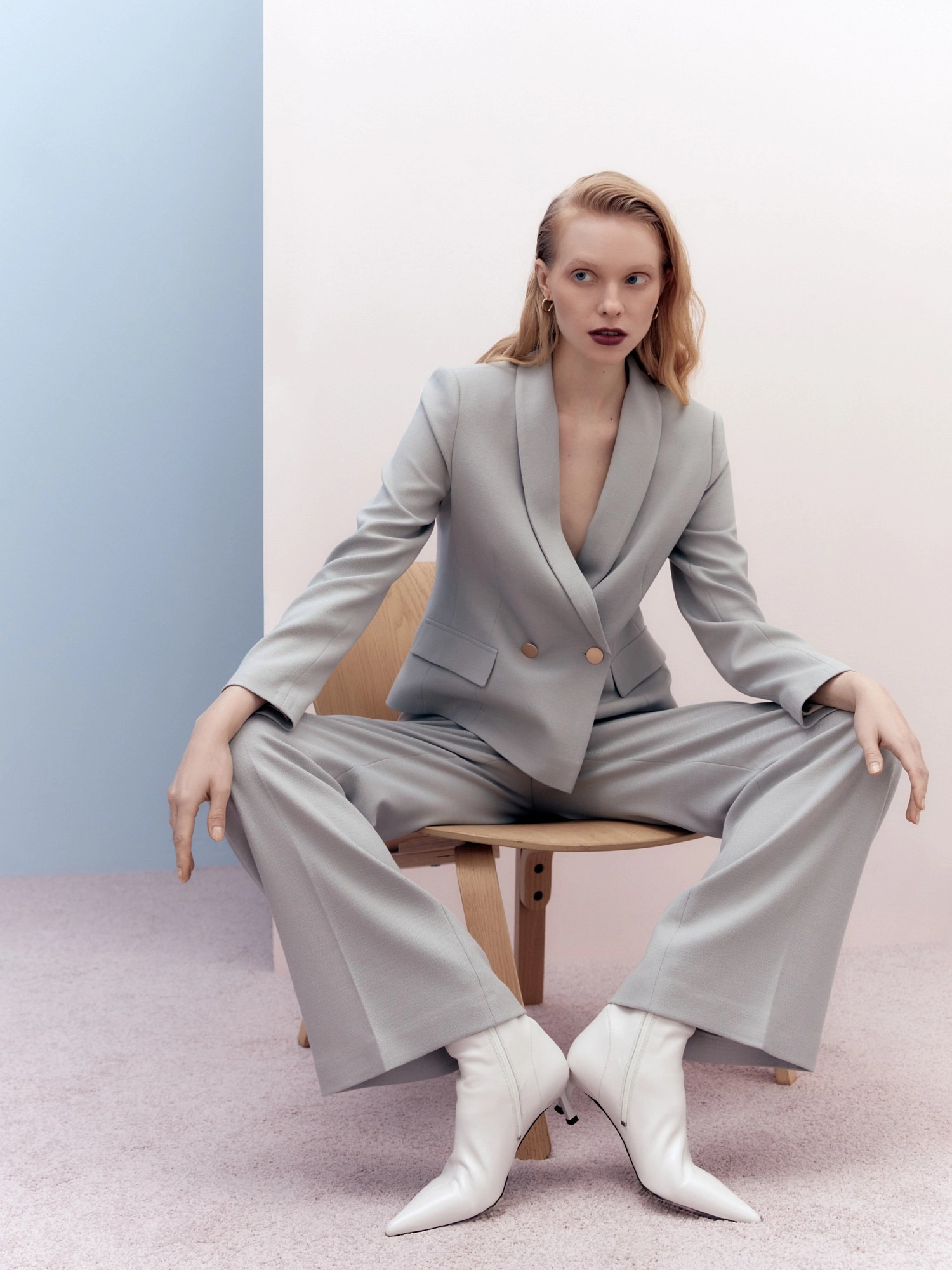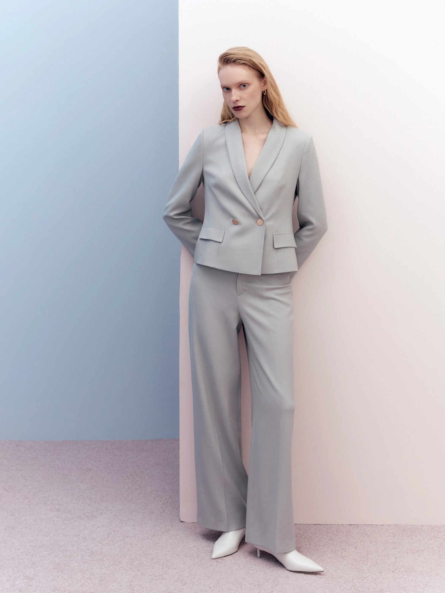 Брюки со стрелками прямого силуэта слегка расклешенные к низу, выполнены из костюмной ткани в бежево-голубом цвете. На притачном поясе, застежка спереди на молнию и крючок. Брюки без карманов.