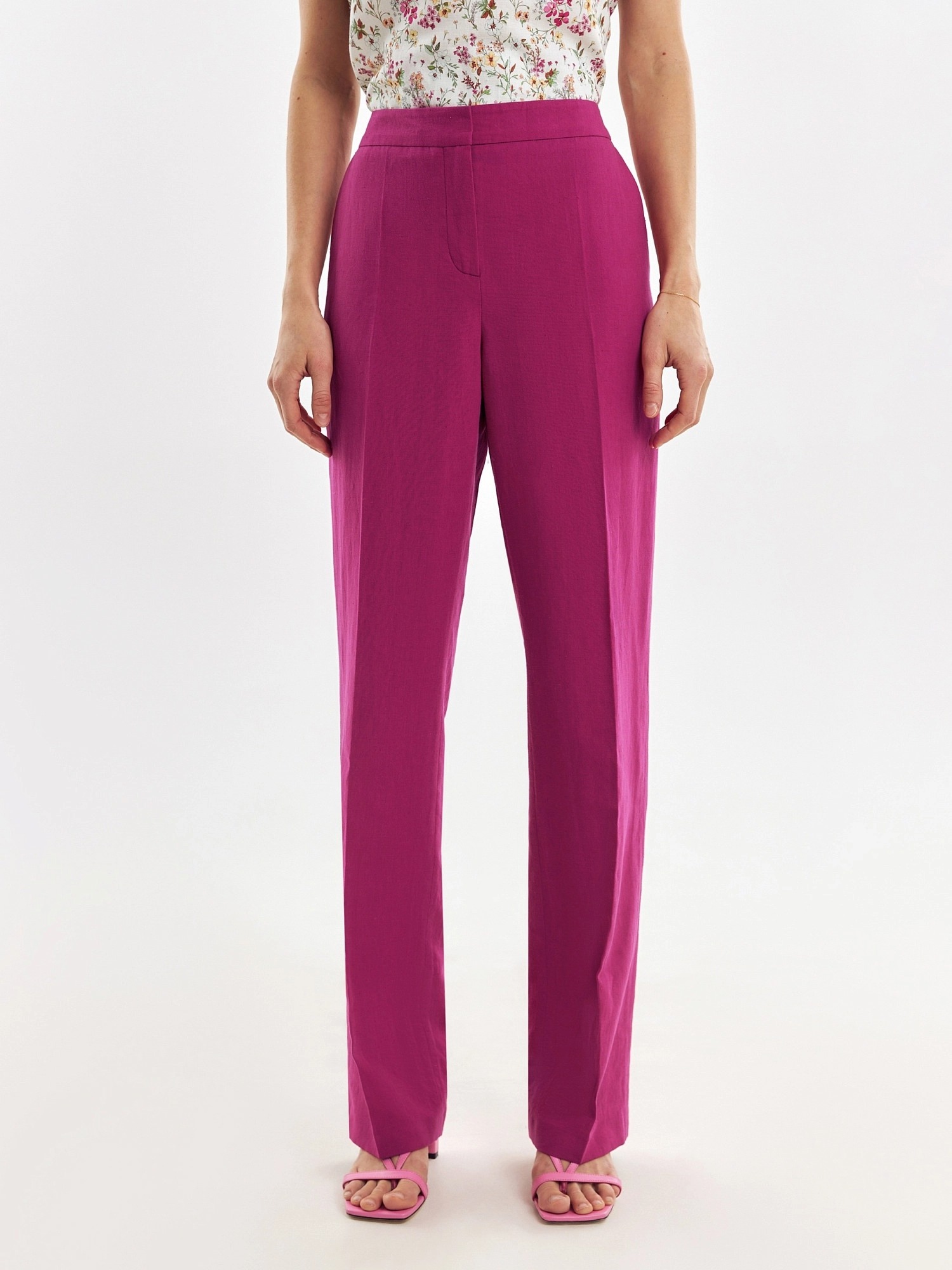 Элегантные брюки из льняной ткани цвета цикламен, прямого силуэта со стрелками на притачном поясе. Застежка спереди на молнию. Карманы в боковых швах.