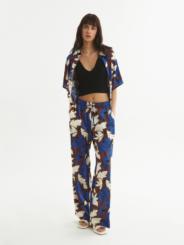 Брюки полной длины, из плательной ткани с крупным цветочным притом, свободной формы, на поясе. В пояс вставлена резинка и кулиcка для лучшей фиксации.