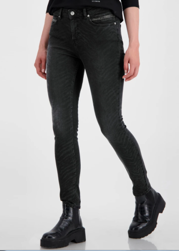 Зауженные джинсы в анималистичном дизайне. Принт зебра по всей поверхности. Передние прорезные карманы украшены декоративной лентой. Накладные задние карманы. Брюки застегиваются на пуговицу и потайную молнию.