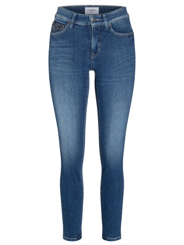 Джинсы с декоративными потертостями и складками. Силуэт slim, высокая посадка, притачной пояс со шлевками, пять карманов.