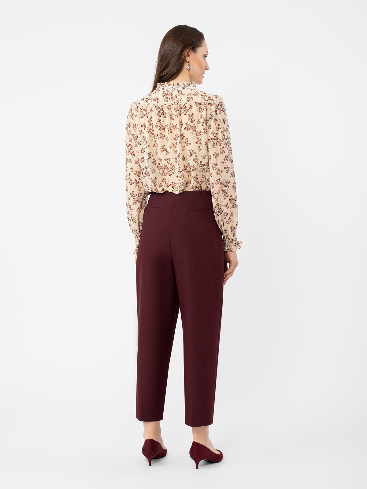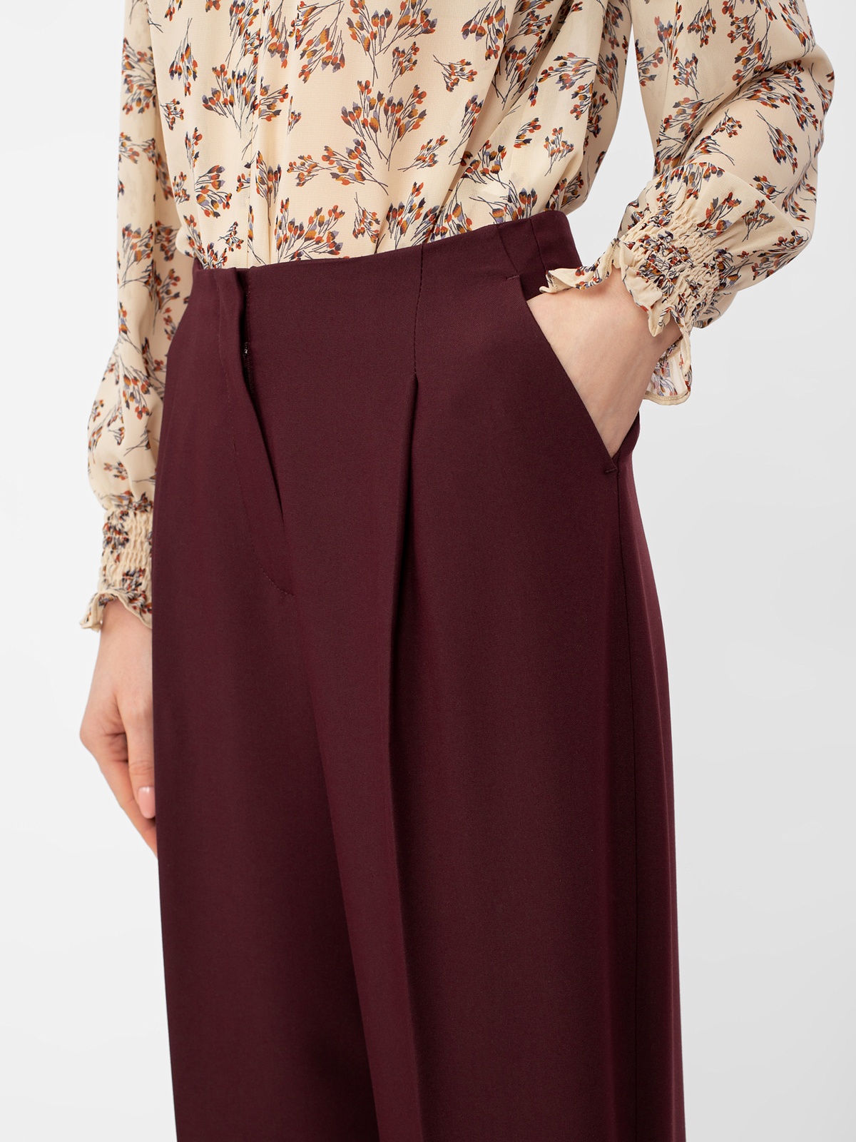 Брюки свободного кроя, длина 7/8. Высокая посадка. Спереди глубокие складки. Застежка на молнию и крючок. Боковые карманы рабочие.