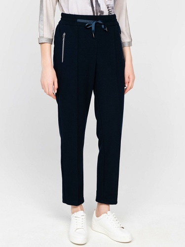 Темно-синие прямые брюки с продольной строчкой задают серьезный тон. Элегантная деталь - атласная лента на поясе. Материал из смеси полиэстера, вискозы и эластана приятен к телу и легок в уходе. Брюки отлично сочетаются с блузками и футболками, а с кроссовками у вас получится современный демократичный образ.