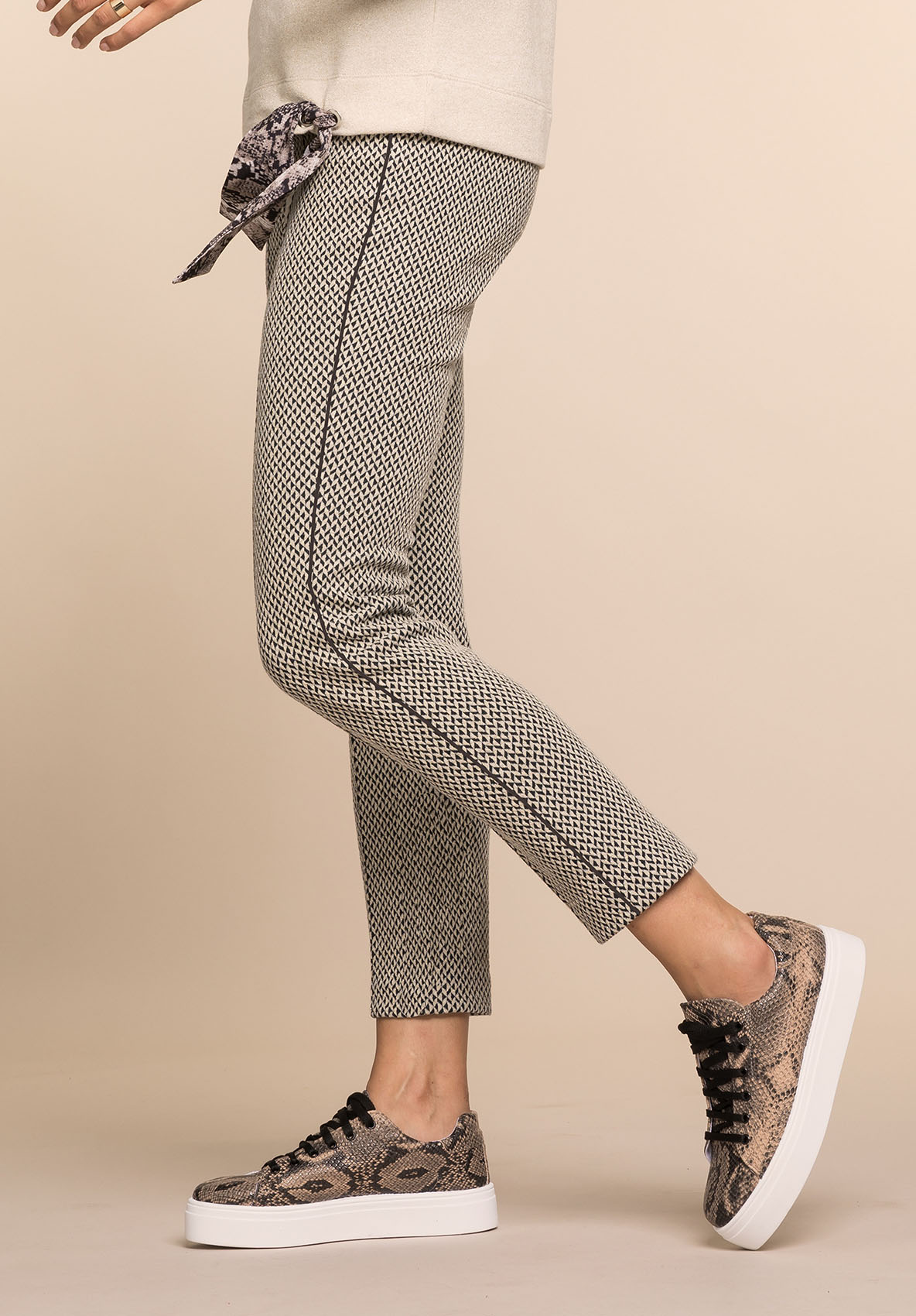 Бежевые джеггинсы Denver с геометрическим узором являются абсолютным законодателем моды. Благодаря высокому проценту эластичных материалов в составе и широкому поясу с декоративной лентой трикотажные брюки очень удобны и являются отличным выбором на каждый день. В сочетании с легкой толстовкой или футболкой брюки создают завершенный образ в стиле кэжуал. • трикотажные жаккардовые брюки с тонкими полосками по бокам • смесь хлопка, вискозы и эластана • широкий пояс с декоративной лентой • укороченные брюки 7/8, рост модели - 180 см • длина около 72 см